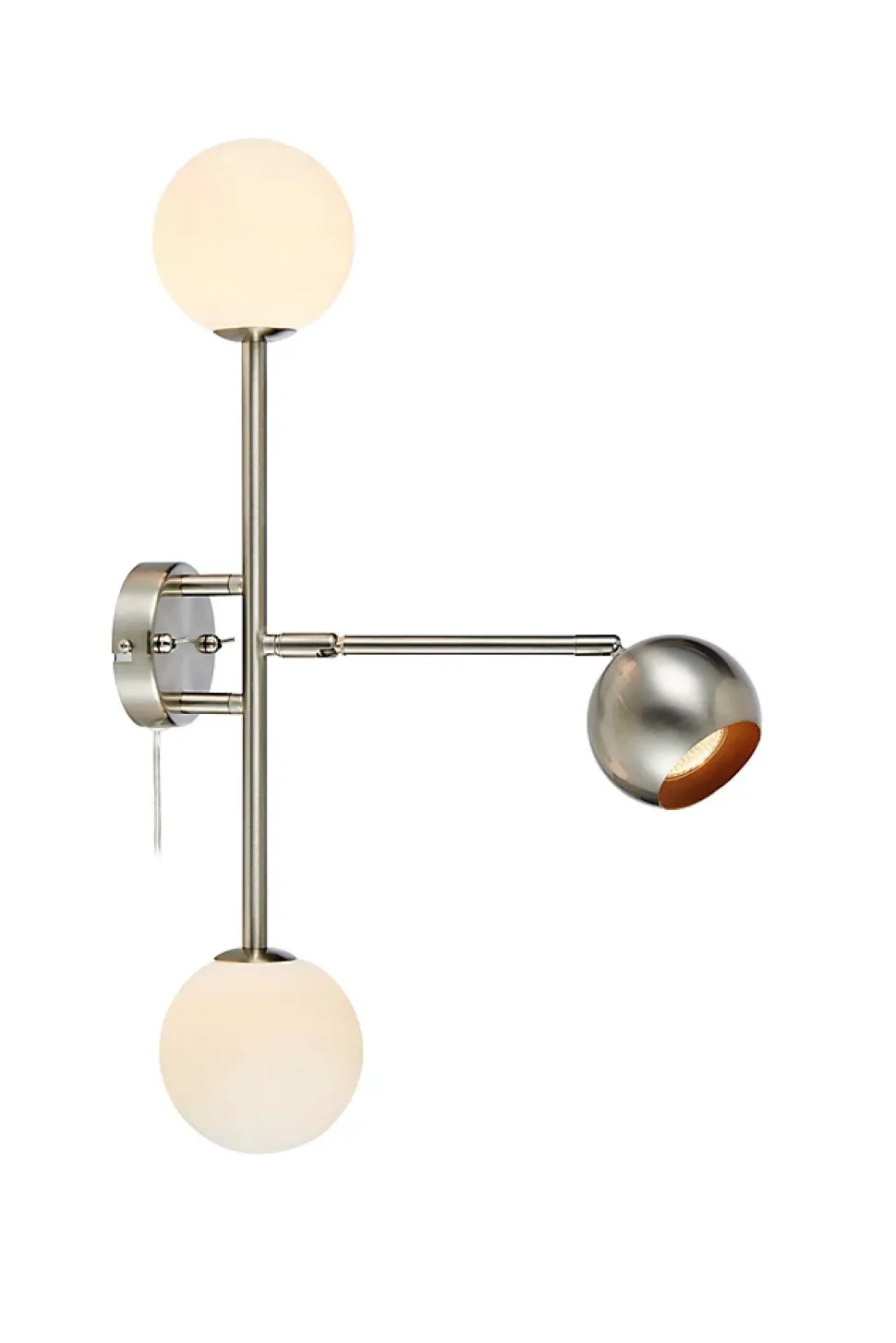 Les caractéristiques techniquesL’applique Beside allie polyvalence et efficacité avec ses trois sources lumineuses : deux ampoules G9 de 20 W max pour un éclairage d’ambiance et une GU10 de 7 W max pour la liseuse directionnelle (non incluses). Elle se fixe au mur via un support, dispose d’un câble transparent de 2 m avec interrupteur intégré à la base murale. Norme IP20, classe II.Les avantages esthétiquesSon design en acier brossé et verre blanc apporte une touche moderne et élégante à toute pièce. Que ce soit en lampe de chevet ou pour éclairer un coin lecture, Beside offre à la fois un style raffiné et une fonctionnalité bien pensée. Une belle option déco, à la fois pratique et contemporaine.