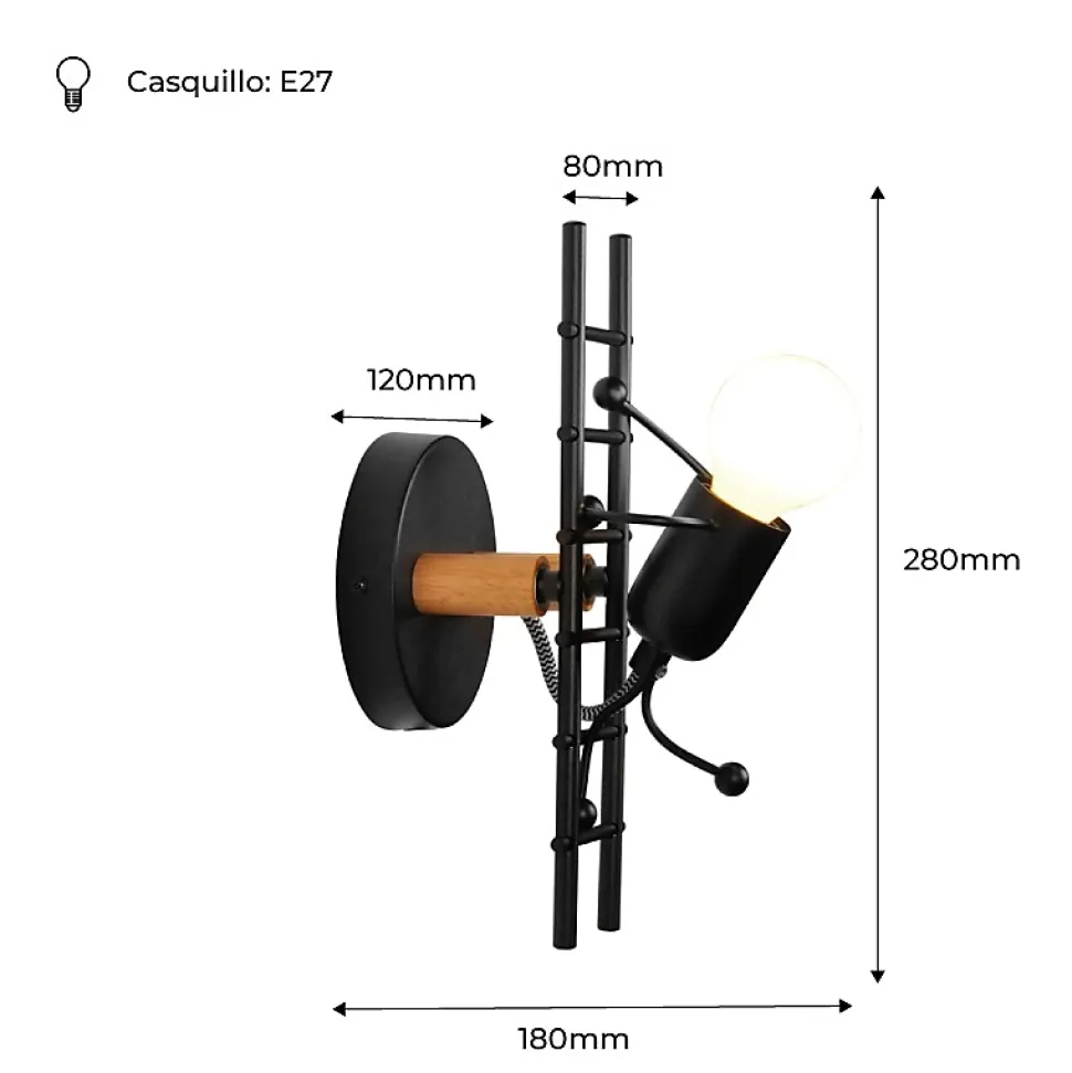 Lapplique murale ESCALADA est une expression moderne et ludique de léclairage intérieur. Avec son design unique de personnage articulé grimpant à une échelle cette lampe allie fonctionnalité et style contemporain. Fabriquée avec des matériaux de haute qualité comme le bois et laluminium elle offre durabilité et résistance. Disponible en plusieurs couleurs laquées noir blanc vert et gris elle sintègre facilement à différents styles de décoration. Son indice de protection IP20 la rend adaptée à un usage exclusivement intérieur idéale pour les chambres denfants salons couloirs et bureaux. Lapplique dispose dune douille E27 compatible avec les ampoules LED jusquà 40W non incluse permettant dajuster léclairage selon vos besoins. Le câble textile noir de style nordique et les accessoires de montage sont inclus pour une installation facile. Caractéristiques principales Design ludique et moderne personnage grimpant à une échelle Matériaux de haute qualité bois et aluminium Différentes finitions noir blanc vert et gris Utilisation en intérieur uniquement IP20 Compatible avec ampoule LED E27 jusquà 40W Fiche technique Tension 220V-240VAC Douille E27 Puissance max 40W Indice IP IP20 Dimensions 180 x 280 mm