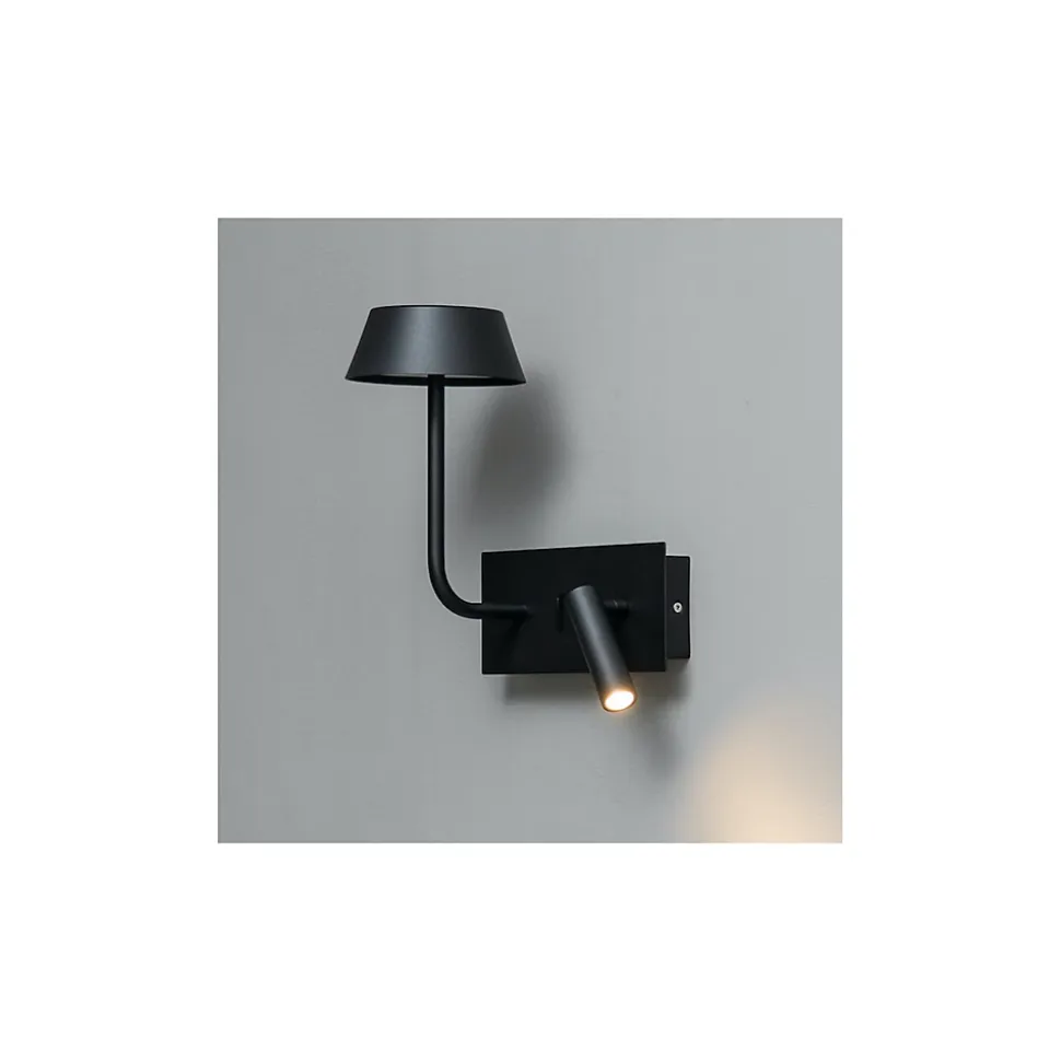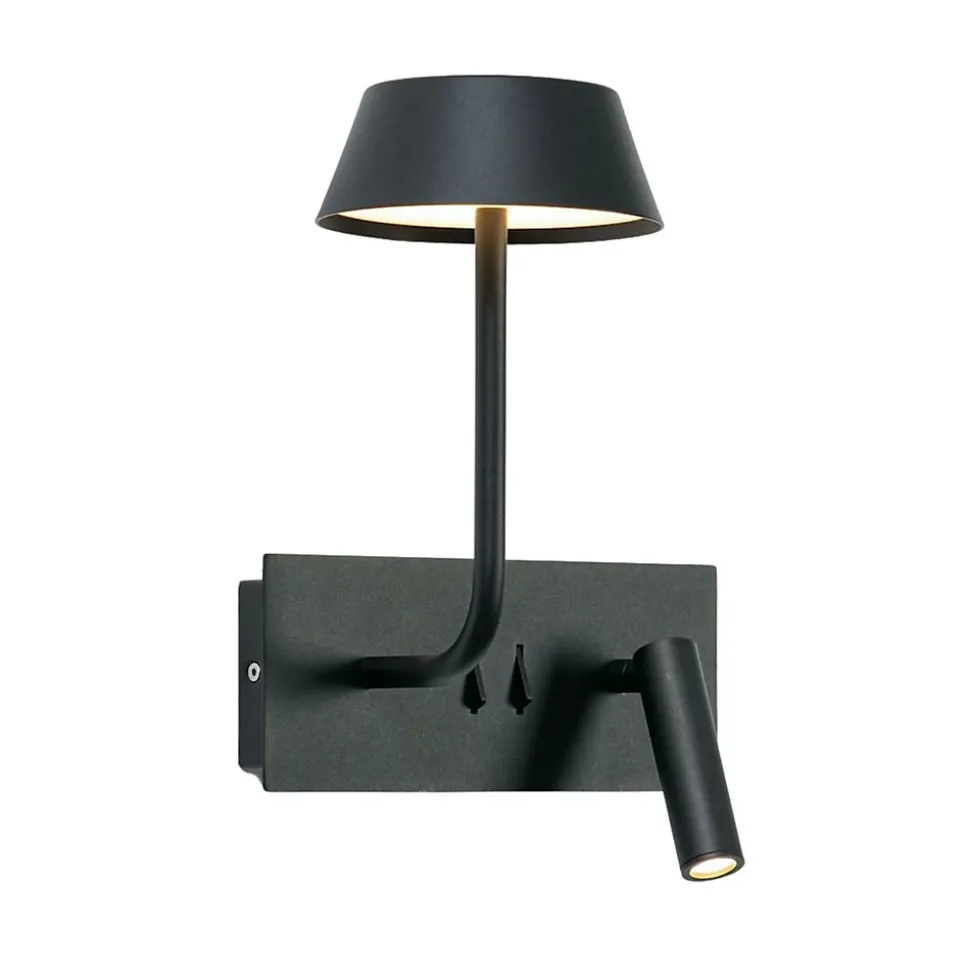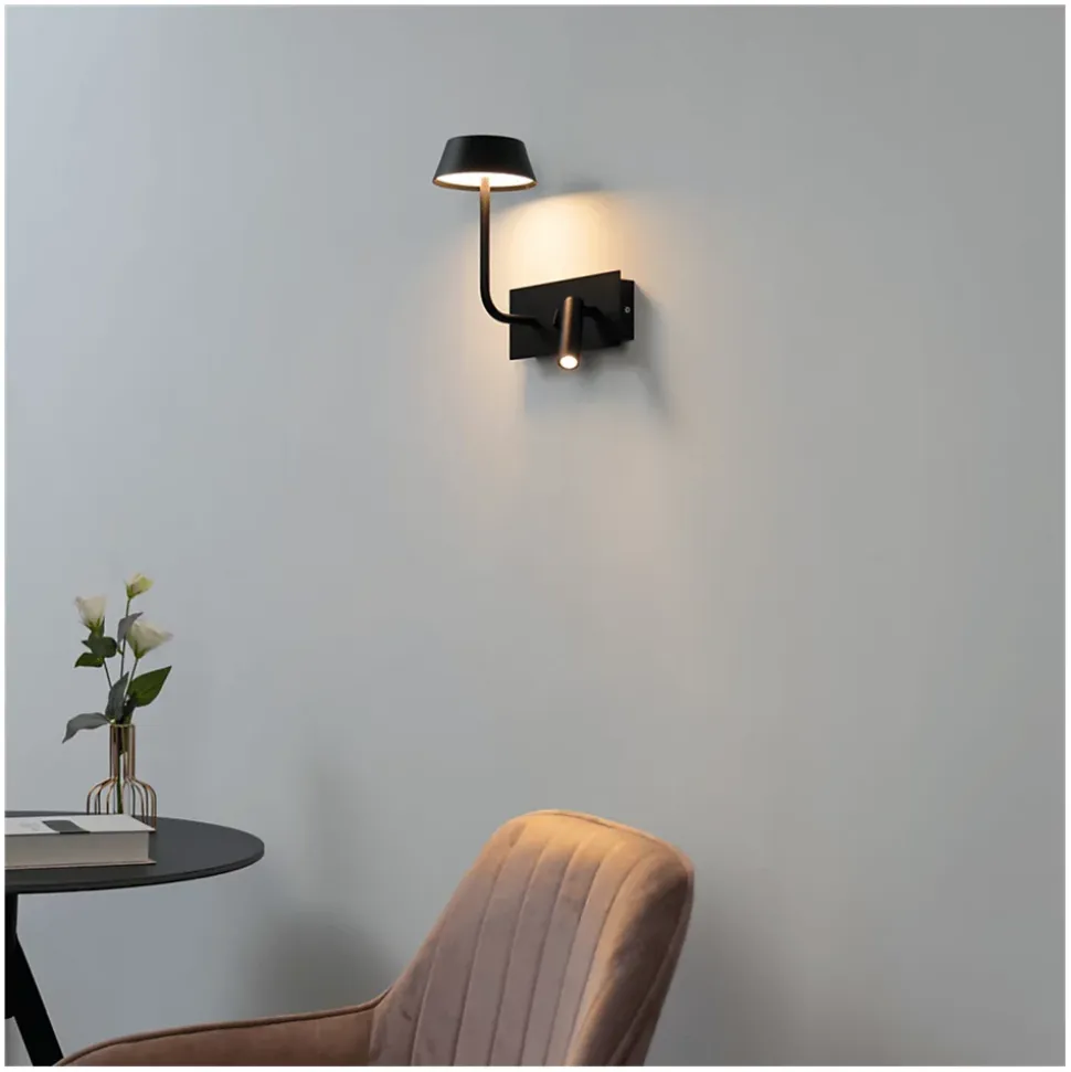 Applique murale liseuse design de couleur noire. Utilisez-la en lampe de chevet. Son petit abat-jour triangulaire rappelle les lampes à poser de type classique. Mais la finition noire et la forme casse cette vision et la modernise. Place à de la sobriété et du design ! Fabro possède deux interrupteurs : un pour la sortie lumineuse principale 6 W, l’autre pour éteindre et allumer la liseuse de 3 W. Celle-ci est d’ailleurs orientable pour un meilleur confort.) Livré monté, prêt à installer (