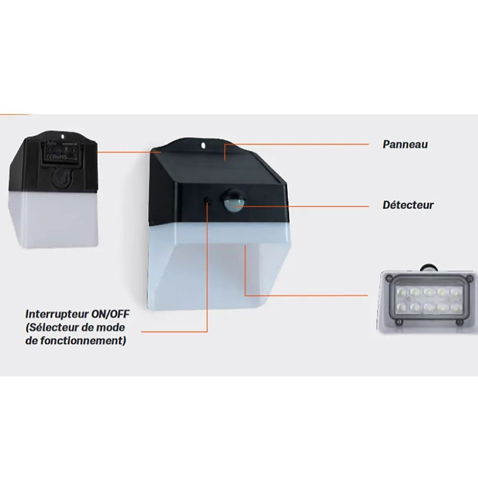 - Deux modes de fonctionnement : Mode A : pleine luminosité + luminosité réduite. Mode B : pleine luminosité + éteint.