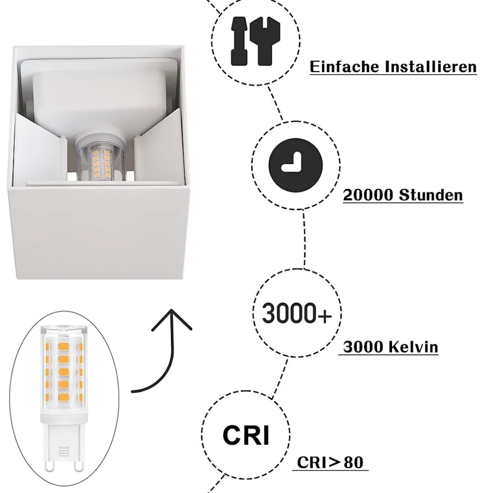 [étanche ip65] cette applique murale d’extérieur est étanche selon la classe de protection ip65 et est donc protégée contre la pénétration d’eau et de poussière. Cela signifie que vous pouvez utiliser la lampe murale à l’extérieur sans crainte, même par mauvais temps comme la pluie ou la neige.[source lumineuse g9 à double tête interchangeable] cette applique murale est équipée de 1 source lumineuse blanc chaud non réglable. Cependant, vous pouvez également acheter les sources lumineuses g9 de votre choix afin de personnaliser la luminosité et la couleur de la lumière pour répondre à vos préférences personnelles et à l’évolution de vos besoins en éclairage.[faisceau réglable] cette applique vous permet de régler l’angle de rayonnement en fonction de vos besoins et de l’environnement afin de créer des effets lumineux flexibles et sur mesure. Adaptez la lumière à vos préférences personnelles et vivez une expérience d’éclairage unique et immersive.[up and down design] grâce à sa conception unique qui diffuse la lumière par le haut et par le bas, vous créez des effets lumineux fascinants qui rendent votre espace extérieur décoratif et visuellement attrayant. Faites briller votre intérieur extérieur et profitez d’une atmosphère détendue.[beau & fonctionnel] l’aspect élégant s’intègre harmonieusement dans les styles d’architecture et de décoration modernes et le métal de haute qualité avec une surface mate est noble et intemporel. Le luminaire s’intègre parfaitement dans différents environnements et peut être utilisé de manière polyvalente. Que ce soit dans le salon, la chambre à coucher ou le bureau, ce luminaire crée toujours une atmosphère agréable et une ambiance élégante.: