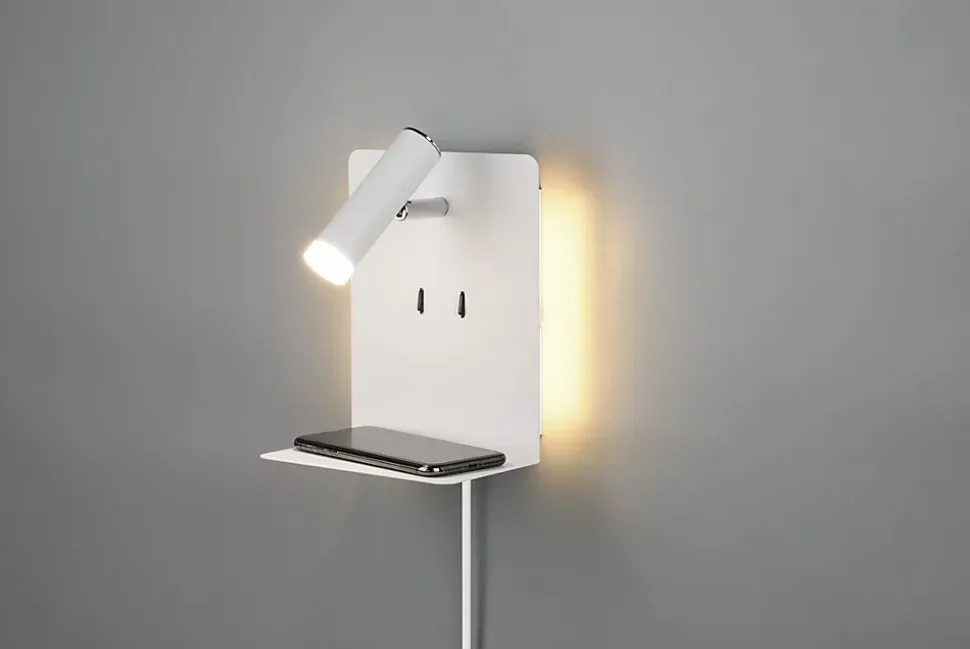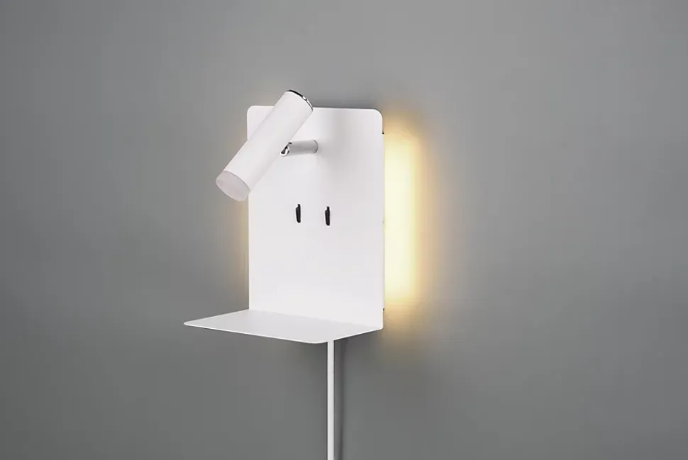 Les caractéristiques techniquesL’applique murale LED Element de TRIO associe sobriété et fonctionnalité. Fabriquée en métal blanc mat, elle propose une lumière principale de 220 lumens (3W) et deux liseuses de 150 lumens chacune (1,5W). Chaque source lumineuse peut être commandée séparément grâce à ses interrupteurs intégrés.Dotée d’un port USB pour recharger facilement vos appareils et d’une étagère pratique, cette applique est parfaite en tête de lit ou dans un espace détente. La fonction FLEXconnect permet un branchement direct ou via un cordon de raccordement.Elle est conçue pour un usage en intérieur avec un indice de protection IP20 et offre une grande longévité (30 000 heures), tout en étant éco-énergétique.Les avantages esthétiquesGrâce à son design minimaliste et intemporel, cette applique s’intègre harmonieusement dans tout style de décoration. Sa couleur blanc mat apporte une touche épurée et élégante qui s’adapte facilement à tous les environnements.La liseuse orientable offre un confort optimal pour la lecture, et la tablette intégrée ajoute une praticité moderne pour poser livres ou accessoires. Un choix parfait pour optimiser l’éclairage et le rangement dans un espace réduit !En plus de ses atouts esthétiques, la technologie LED intégrée garantit jusqu’à 80 % d’économies d’énergie par rapport aux luminaires traditionnels, tout en respectant l’environnement.