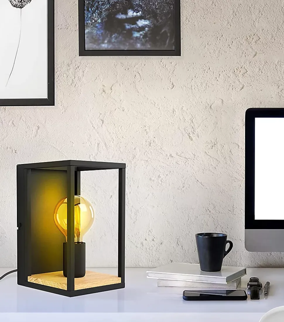 - L’applique murale LIBERTAD se compose d’un cadre en métal noir cubique associé à un plateau en bois d’hévéa décoratif.