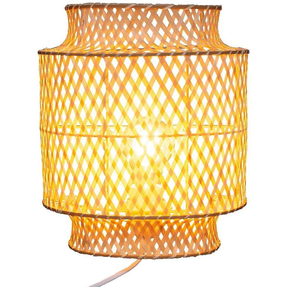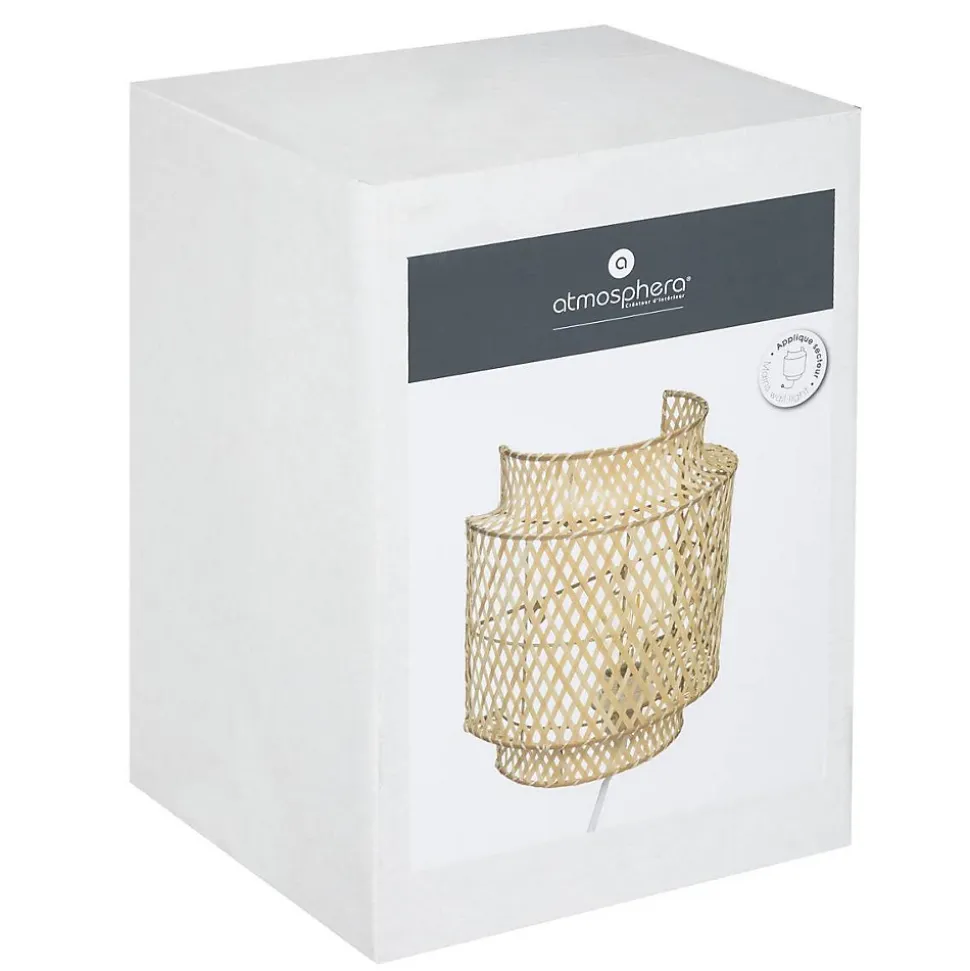 Ajoutez une touche ethnique à votre décoration grâce à l’applique murale « Liby » en bambou Atmosphera.Lumière douce et design originalAvec sa forme inspirée des luminaires originaires d’Asie, l’applique murale « Liby » vous fera instantanément voyager à l’autre bout du monde. Son abat-jour en bambou tressé ajoutera une touche exotique à votre intérieur, tout en diffusant une douce lumière tamisée, entrecoupée de motifs géométriques discrets. Cette applique murale doit être branchée sur secteur.Choisissez l’ampoule LED Atmosphera à filament droit ou à filament torsadé qui ira le mieux avec votre applique murale « Liby ».Le petit plus décoUn fauteuil à bascule en rotin associé à une table d’appoint en bois et à des coussins en coton coloré compléteront votre déco ethnique.