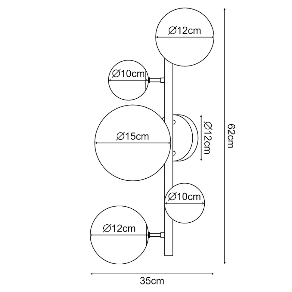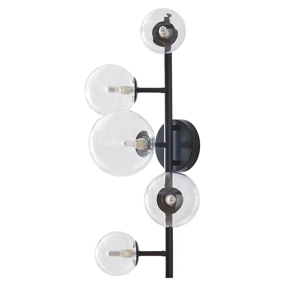 Applique muraleCette applique murale chic et intemporelle séduit par son design individuel et stylé. Elle s’intègre harmonieusement dans différents styles d’aménagement, du moderne au classique.Avec sa construction à 5 lampes, le luminaire assure un éclairage uniforme de différentes zones. Les douilles robustes maintiennent les ampoules utilisées en toute sécurité et garantissent un fonctionnement fiable.Que vous ayez besoin d’une source de lumière supplémentaire dans votre couloir, votre bureau ou votre chambre, cette applique décorative et pratique apporte une touche de raffinement et crée une atmosphère agréable.Son installation se fait rapidement et sans difficulté, les accessoires de montage étant inclus dans la livraison.Points forts du produit :- applique murale élégante- idéal pour votre espace de vie- abat-jour en forme de boule en verre transparent- montage mural simple- avec 5 douilles de lampe stablesDonnées techniques :- douille de lampe : 5 x G9, max. 9W (livré sans ampoule)- tension : 230V, 50Hz- type d’interrupteur : mural- type de protection : classe de protection IIDimensions :- totales (h x l x p) : 62 x 35 x 23,5 cm- fixation murale (Ø) : 12 cmMatière :- support : métal- abat-jour : verreCouleur :- support : noir- abat-jour : transparentContenu de la livraison :1 x applique murale (ampoules non incluses)Produit de la marque :lux.pro