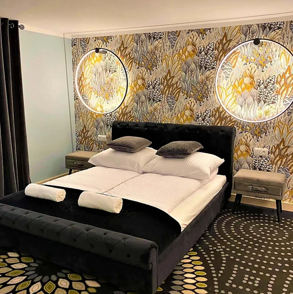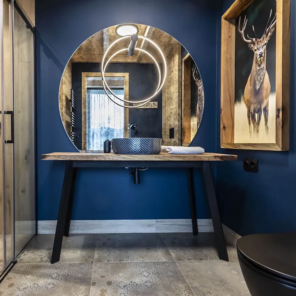 Applique murale miroir en métal noir avec source lumineuse LED CCT intégrée et indice de protection IP44.