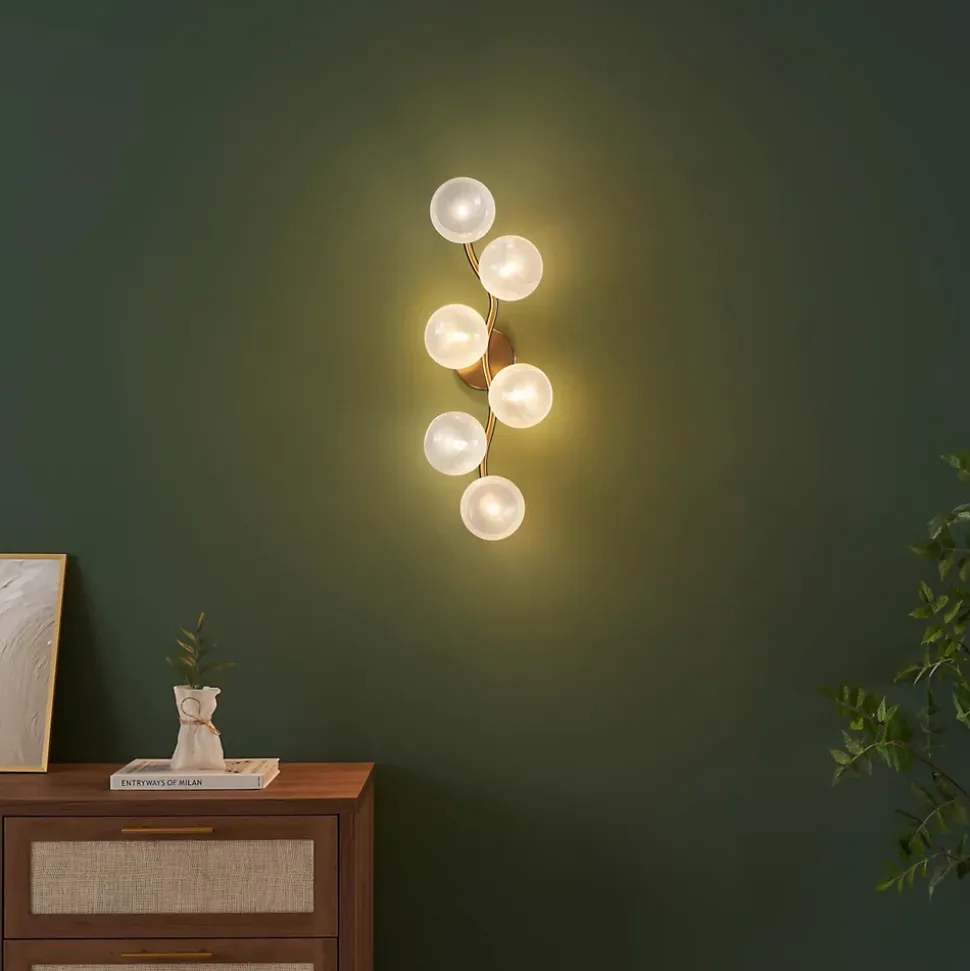 L’applique murale Isalina séduit par son design symétrique et raffiné. Dotée de six globes en verre montés sur une structure dorée, elle diffuse une lumière harmonieuse, parfaite pour sublimer les grands espaces. Elle fonctionne avec six ampoules G9 (non incluses), offrant un éclairage doux et élégant.) Assemblage simple requis (