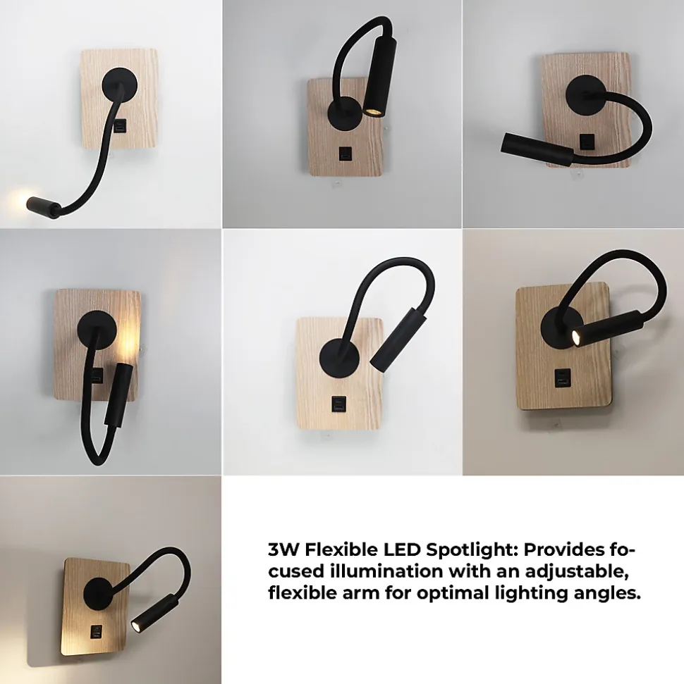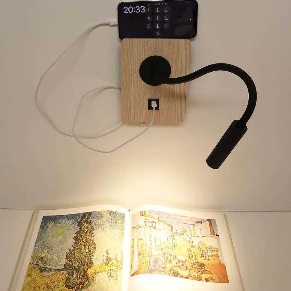 Applique murale LED MULAN avec port USB Type C et lumière de lecture blanc chaud Description longue Lapplique murale MULAN combine élégance et fonctionnalité pour offrir une solution idéale à la fois pour la lecture nocturne et pour charger vos appareils mobiles. Avec son bras flexible orientable et son port USB intégré ainsi quun port de charge Type C cet applique est parfait pour les têtes de lit les tables de chevet et bien plus. Son design moderne et ses matériaux de haute qualité en font un choix pratique et stylé. Caractéristiques principales LED intégrée et orientable Fournit un éclairage précis et dirigé idéal pour la lecture. Surface avant effet bois Apporte une touche esthétique et durable à votre espace. Port USB et Type C Chargez vos appareils mobiles facilement et rapidement. Interrupteur individuel intégré Un contrôle simple et pratique pour allumer ou éteindre lapplique. Support intégré Pour poser des objets décoratifs ou des appareils mobiles de manière pratique. Fiche technique Matériaux Bois et aluminium Puissance LED 3W Température de couleur Blanc chaud 2800K Dimensions 130 x 170 x 455 mm IP20 Pour usage intérieur Cet applique MULAN est le choix parfait pour ceux qui recherchent à la fois fonctionnalité et design dans leur espace.