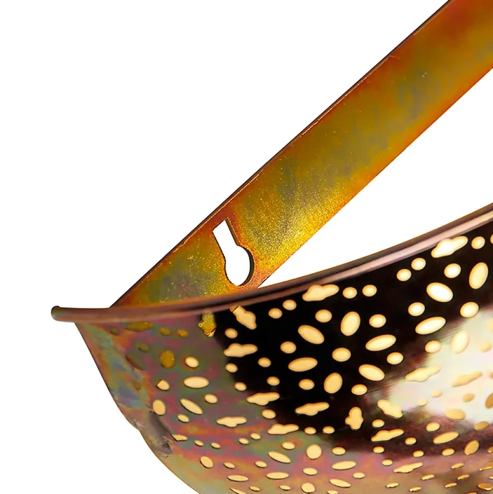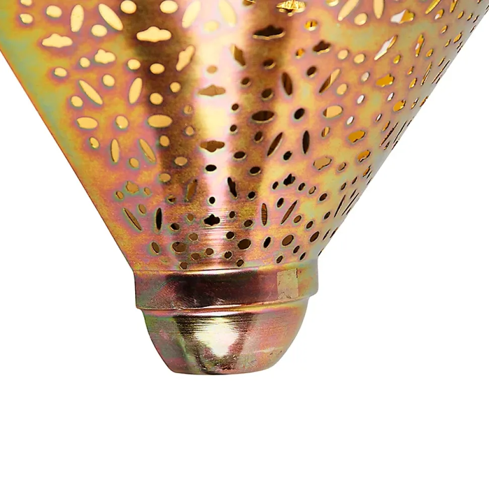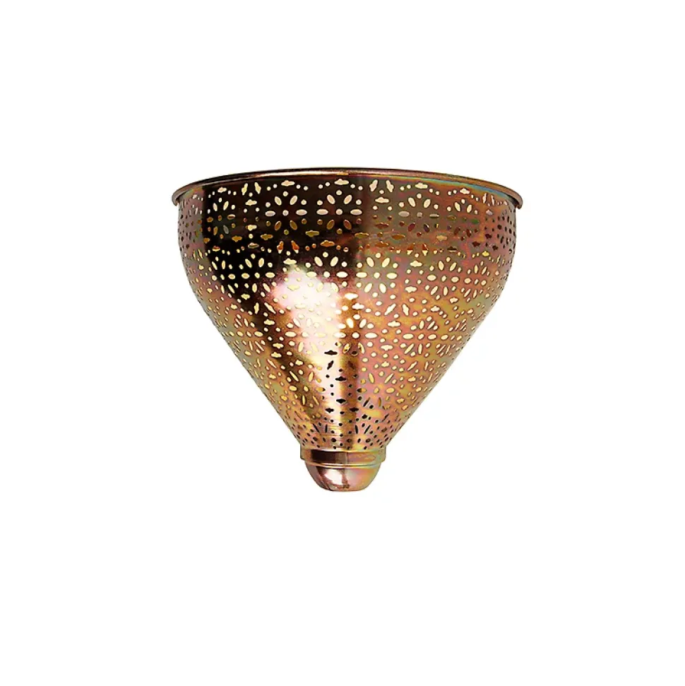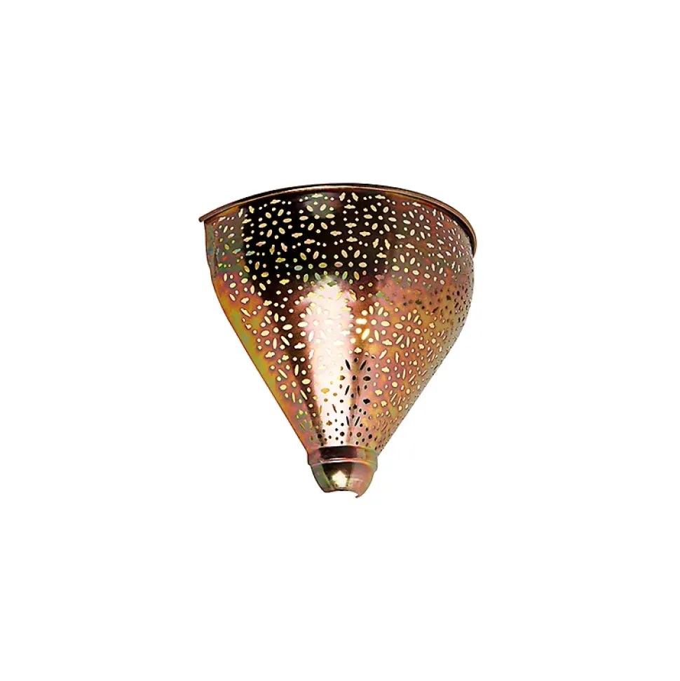 Une applique en cuivre à la finition magnifique et au design unique. Son abat-jour ouvert crée un beau jeu de lumière sur le mur et le plafond. Elle est un véritable atout pour le salon ou le couloir. Elle crée également une atmosphère cosy dans la chambre à coucher. Elle mesure 20 cm de haut et 25 cm de long. Sa profondeur est de 11,5 cm. Complétez votre Muraf avec une ampoule E14 (40W maximum). L’ampoule n’est pas incluse. Vous pouvez atténuer la lumière de l’applique avec un variateur externe. Apportez une atmosphère orientale et cosy à votre intérieur avec notre Muraf !