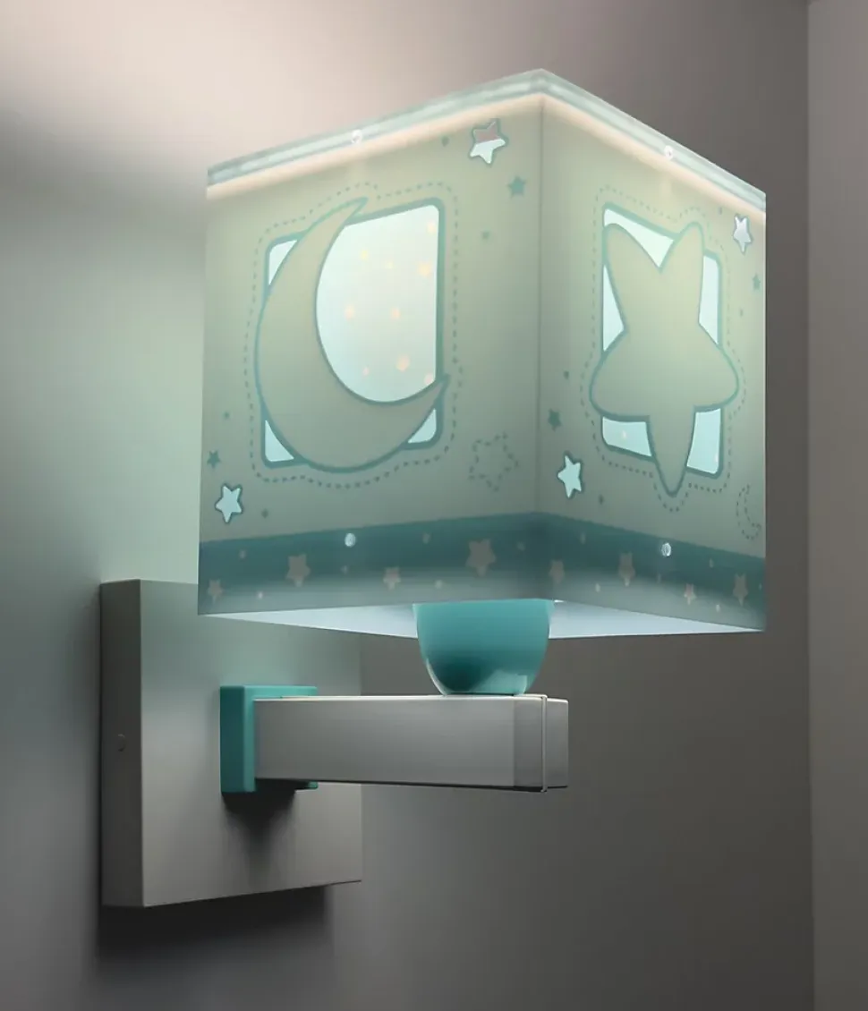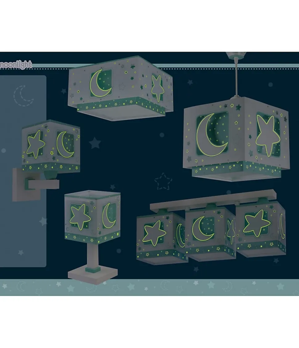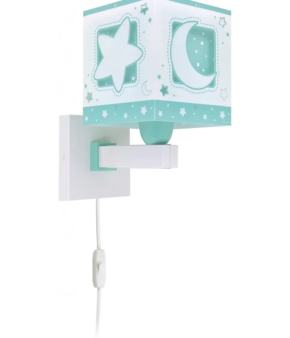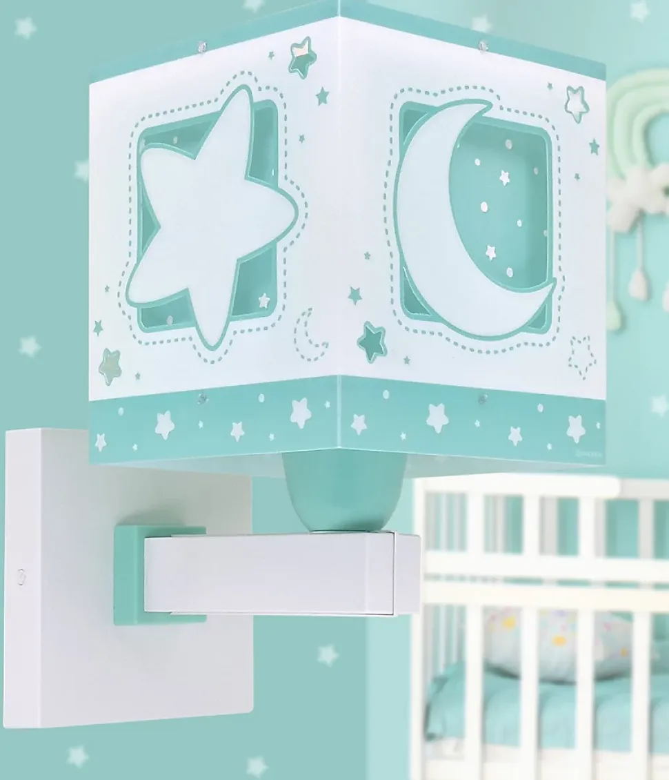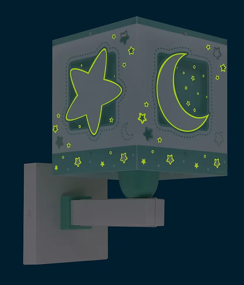 Applique murale pour enfant Moonlight lune et étoiles de couleur vert Double affichage, installation filaire et sans fil avec interrupteur et étoiles et lune brillent dans le noir.