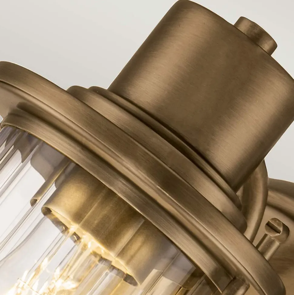 L’applique murale Riggs 1 lumière, est finie en laiton vieilli, avec un verre strié clair. Elle a un aspect industriel léger et est conforme à la norme IP44 pour les salles de bains.