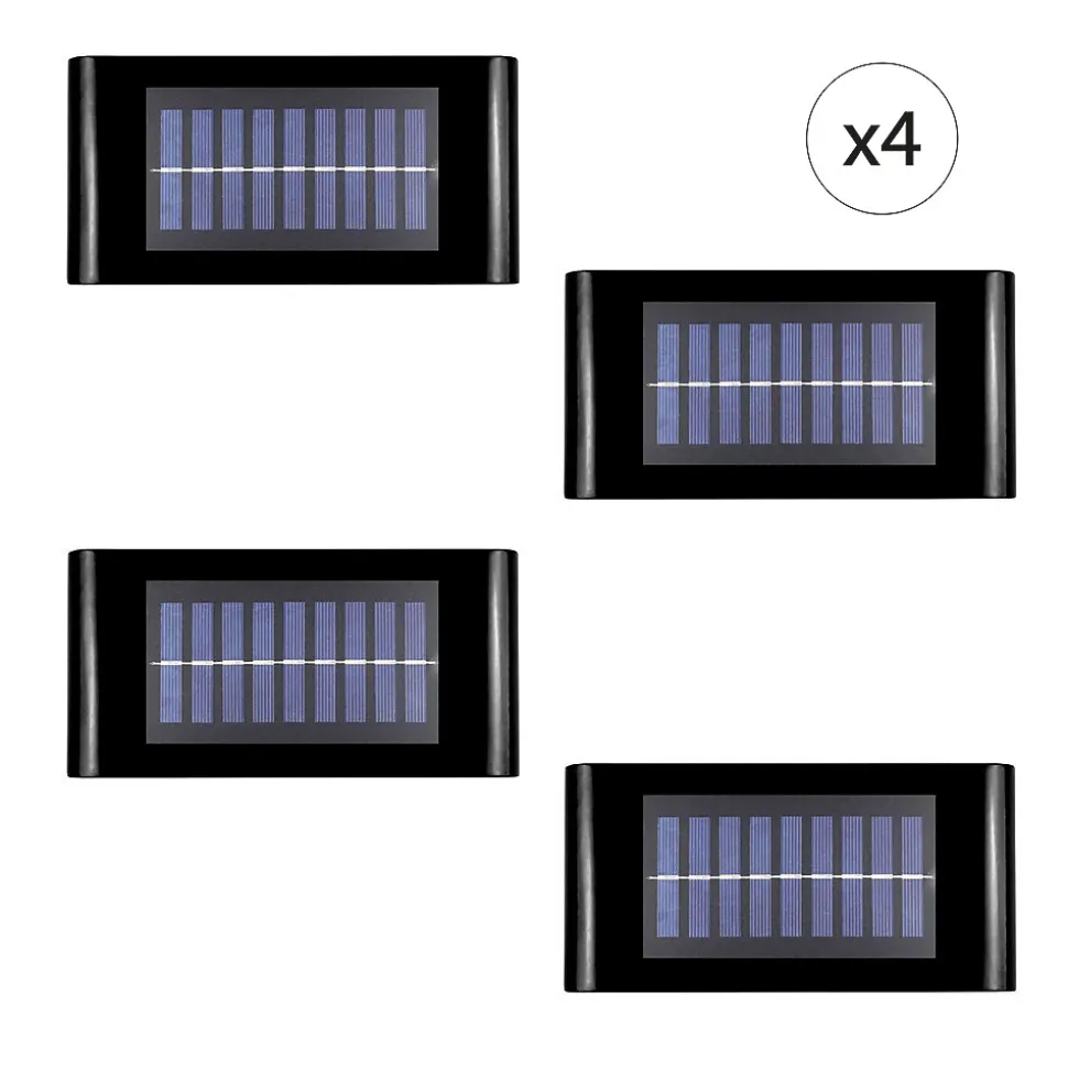 . Détecteur de luminosité . Waterproof IP65 . Revêtement plastique ABS . Batterie de 400 mAh . Temps de charge de 8h . Autonomie de 6h . Panneau solaire intégré pour une installation sans fil . Éclairage haut et bas . Lot de 4