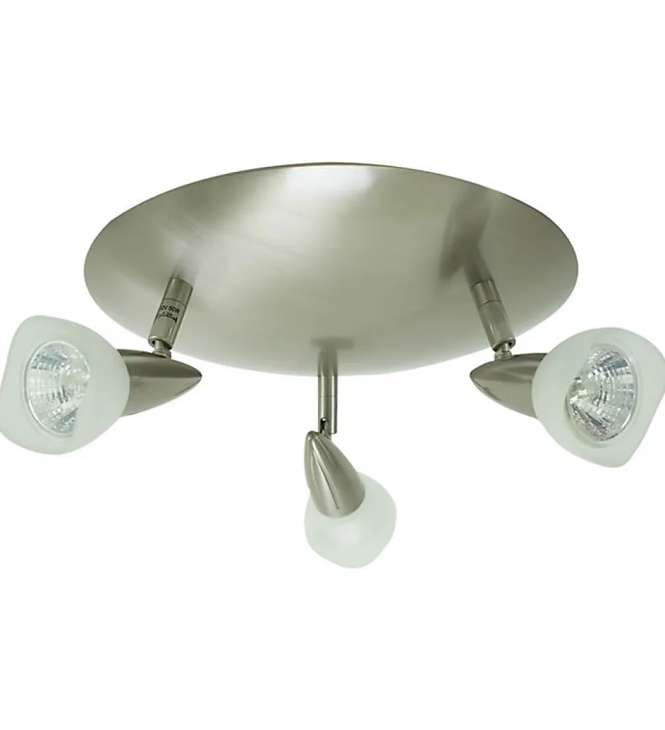 Applique murale ou Plafonnier 3 Spots orientables 3 x 50 W MIRAGE AE1561136 – Acier brossé – Ampoules fourniesGrâce au design de ce Plafonnier et ses 3 Spots orientables vous offrirez à votre intérieur un style contemporain et élégantCompatible avec les ampoules LED, halogène, fluocompact, économie d’énergie. Descriptif :Marque : XELUX Modèle : AE1561136 MIRAGECouleur : Acier brosséType : Plafonnier ou applique murale 3 SpotsDimensions (diam) : 265 mmFinitions diffuseurs : Mirage (verre trempé)Diamètre diffuseur : 60 mm Type d’ampoule : EXN 12 V (Halogènes)Puissance max : 3 x 50 W Tension : 230 V – 50. HzCompatible avec LED et ampoules à économie d’énergie Normes et sécurité : CE – F Contenu : – 1 Plafonnier 3 Spots – Accessoires de fixation – 1 notice d’utilisation – 3 Ampoules Les plus produits : Le Plafonnier en acier brossé 3 Spots conviendra parfaitement à toutes les pièces de votre habitat.Que vous souhaitiez l’installer au mur ou au plafond il apportera une touche design à votre intérieur.Ses Spots orientables et inclinables vous permettront d’ajuster l’éclairage selon vos besoins. Grâce à leur puissance elles vous assureront une répartition de lumière optimale.Compatible LED pour une durée de vie des ampoules plus longue et une économie d’énergie plus importante. Facile à poser, ce Plafonnier 3 Spots orientables allie sécurité et robustesse.