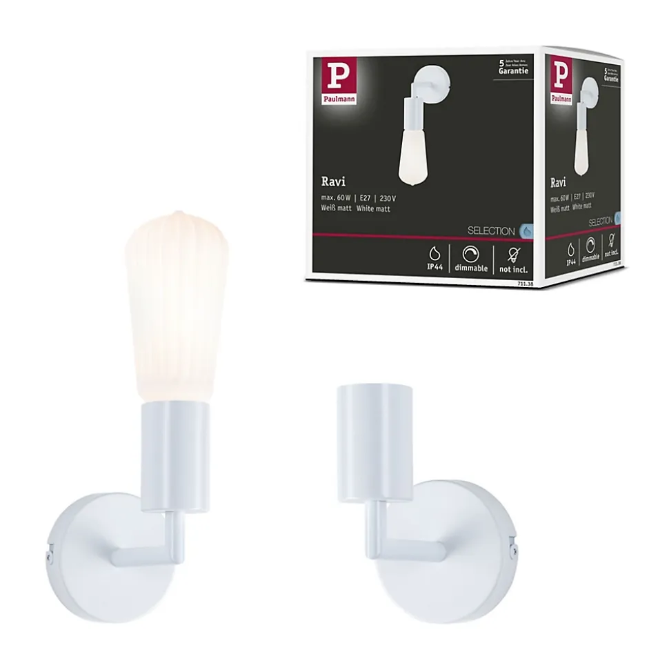 L’effet Mix & Match résolument tendance permet d’embellir l’intérieur avec un accroche-regard original. L’applique moderne Ravi en Blanc dépoli en est l’illustration parfaite. Avec son design moderne minimaliste et sa combinaison de coloris attrayante, cette pièce phare est du plus bel effet dans un intérieur. En combinaison avec les ampoules décoratives de Paulmann, il forme le duo parfait. Le luminaire offre un effet particulièrement harmonieux lorsqu’il est associé à des ampoules des séries White Lampion ou Metallic Glow. Les ampoules équipées de culot E27 et de max. 60 watts offrent une autre alternative. Grâce à la protection IP44, l’applique Ravi peut même être utilisée dans la salle de bain. Selon l’ampoule utilisée, la lampe est dimmable.