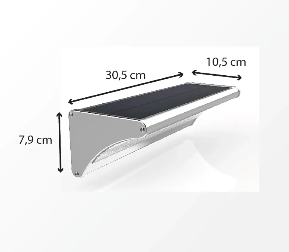 Applique solaire avec détecteur de mouvement IP65. Couleur(s) : blanc. Classe énergétique A++. Matériau : aluminium. Puissance 8.1W. Intensité lumineuse : 1100lm. Capacité de charge : 6000 mah. Indice de protection : IP65. Dimensions(L x l x h) : 30.5 cm x 11 cm x 8 cm