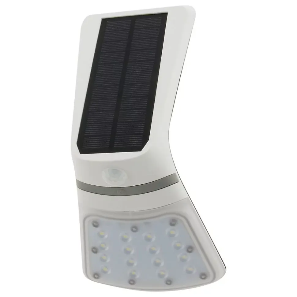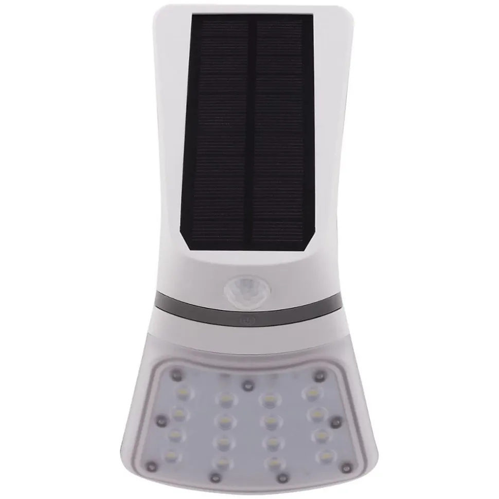 Applique solaire LED + détecteur de mouvement. Couleur(s) : blanc. Puissance : 2W. Intensité lumineuse : 240lm. Indice de protection : IP65. Nombre de LEDs : 16 à l’avant. Angle de détection : 120°. Portée : 6 mètres. Autonomie : 5h. Temps de charge : 7h. Batterie : LI-ion 3,7V 1200mAh. Interrupteur : Off / Auto