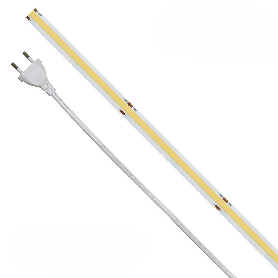 Bande LED COB monochromatique de 5 m, 14 watts/mètre, connexion directe au 220 V. Excellente luminosité.La bande LED COB colorée est une bande LED de nouvelle génération qui permet d’avoir une seule ligne de lumière, éliminant les > gênants pour l’œil. La bande LED cob colorée est disponible en trois couleurs de lumière : bande LED cob lumière chaude (3000K), bande LED cob lumière naturelle (4000K) et bande LED cob lumière froide (6000K). Cette bande LED possède un angle d’ouverture de lumière grâce auquel il est possible d’avoir une lumière à 180°, avec un faisceau assez diffusé.Où puis-je placer ma bande LED colorée 14W/m ?Il s’agit d’une bande LED de 14 w/m adaptée à tout type d’application interne ou externe. Cette bande LED avec indice de protection IP65 est pliable et peut être utilisée pour éclairer des environnements résidentiels ou de travail, et est également utilisée pour éclairer les jardins, les parterres de fleurs, les cours et les espaces extérieurs en général.Flux lumineux de la bande LED COB lumière chaude (3000K) : 1200lm/mtFlux lumineux de la bande LED COB lumière naturelle (4000K) : 1300lm/mFlux lumineux de la bande LED COB lumière froide (6000K) : 1350lm/mtCe modèle de bande LED possède un indice de protection IP65 qui le rend adapté aussi bien à un usage externe qu’interne. La bande LED Cob monochrome est alimentée directement en 220Volt, elle ne nécessite donc pas d’alimentation électrique, il suffit d’insérer la fiche dans la prise appropriée pour une utilisation très pratique.Chaque bande LED est dimmable, ce qui signifie qu’il est possible de faire varier l’intensité de la lumière avec les contrôleurs avec télécommande appropriés que vous pouvez trouver ICI. La bande LED COB 220 volts peut être coupée tous les 16,6 cm. Si vous souhaitez faire plus de coupes, vous aurez peut-être besoin de quelques accessoires que vous pouvez trouver ICI