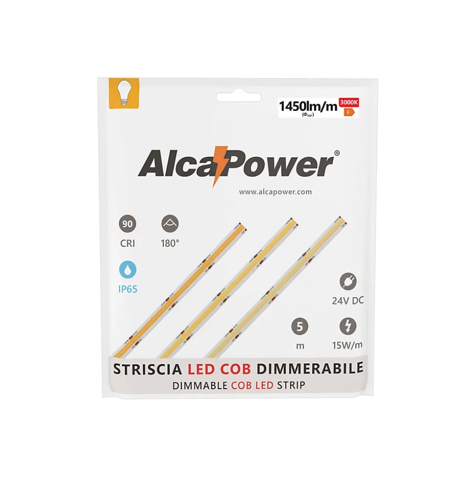 Bande LED COB monochromatique de 5 m, 15 watts/mètre, connexion directe au 24 V. Excellente luminosité.La bande LED COB monochrome est une bande LED de nouvelle génération, en effet elle permet d’avoir une seule ligne de lumière, éliminant les > gênants pour l’œil. La bande LED COB monoculaire est disponible en trois couleurs de lumière : bande LED COB à lumière chaude (3000K), bande LED COB à lumière naturelle (4000K) et bande LED à lumière froide (6000K). Cette réglette LED possède un angle d’ouverture de lumière grâce auquel il est possible d’avoir une lumière à 180°, avec un faisceau assez répandu.Où puis-je placer ma bande LED colorée 15W/m ?Il s’agit d’une bande LED de 15 W/m adaptée à tout type d’application interne ou externe. Cette bande LED avec indice de protection IP65 est pliable et peut être utilisée pour éclairer des environnements résidentiels ou de travail, et est également utilisée pour éclairer les jardins, les parterres de fleurs, les cours et les espaces extérieurs en général.Flux lumineux de la bande LED COB lumière chaude (3000K) : 1450lm/mFlux lumineux de la bande LED COB lumière naturelle (4000K) : 1500lm/mFlux lumineux de la bande LED COB lumière froide (6000K) : 1500lm/mCe modèle de bande LED possède un indice de protection IP65 qui le rend adapté aussi bien à un usage externe qu’interne. La bande LED COB monochrome est alimentée directement en 24 Volts, elle nécessite donc une alimentation.Chaque bande LED est dimmable, ce qui signifie qu’il est possible de faire varier l’intensité de la lumière avec les contrôleurs avec télécommande appropriés que vous pouvez trouver ICI. La bande LED COB 24V peut être coupée tous les 4,5 cm. Si vous souhaitez faire plus de coupes, vous aurez peut-être besoin de quelques accessoires que vous pouvez trouver ICI