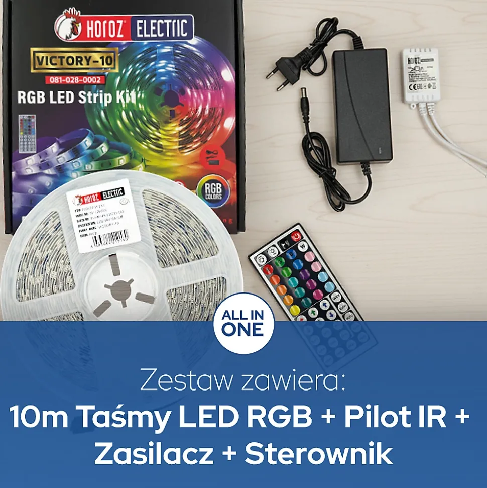 Kit bande LED RGB 24V 10W/m 800lm/m IP20 avec contrôleur alimentation et télécommande rouleau 10m VICTORY-10 | HOROZ | 081-028-0002Données techniques :✔️Code produit : 081-028-0002✔️Utilisation : intérieur✔️Tension (V) : 220V / 24V✔️Puissance (W/m) : 10W/m✔️Type de LED : SMD (50×50) – 3 puces✔️Indice de rendu des couleurs (Ra) : >Ra80✔️Température de couleur (K) : RGB✔️Matériaux : plastique✔️Classe de protection électrique : III✔️Dimmable : oui (avec télécommande)✔️Longueur : 10 m✔️Flux lumineux (lm/m) : 800 lm/m✔️Durée de vie nominale : 25 000 h✔️Indice de protection : IP20✔️Fixation : ruban adhésif résistant✔️Contenu de l’emballage : rouleau de 10 m de bande LED contrôleur alimentation télécommande.Dimensions :✔️Longueur : 10 m✔️Largeur : 10 mm✔️Découpe possible tous les 10 cmInstallation facile – collez et branchez simplementLa bande LED est équipée d’un ruban adhésif solide assurant une fixation fiable sur la plupart des surfaces.Il suffit de :1. Retirer la protection de l’adhésif,2. Coller la bande LED à l’emplacement souhaité,3. Brancher l’alimentation et le contrôleur,4. Allumer à l’aide de la télécommande – et c’est prêt !Pourquoi choisir ce produit ? ✔️Kit complet « Plug & Play » – aucun accessoire supplémentaire requis. ✔️Technologie LED SMD économe en énergie – lumière puissante faible consommation. ✔️Éclairage RGB personnalisable – contrôlez la couleur et l’ambiance selon vos envies. ✔️Haute qualité et longue durée de vie – jusqu’à 25 000 heures d’utilisation. ✔️Sécurité optimale – basse tension 24V et classe de protection III. ✔️Structure flexible et découpable – ajustez la longueur selon vos besoins. ✔️Certifications CE et RoHS – conformité et sécurité garanties selon les normes européennes.