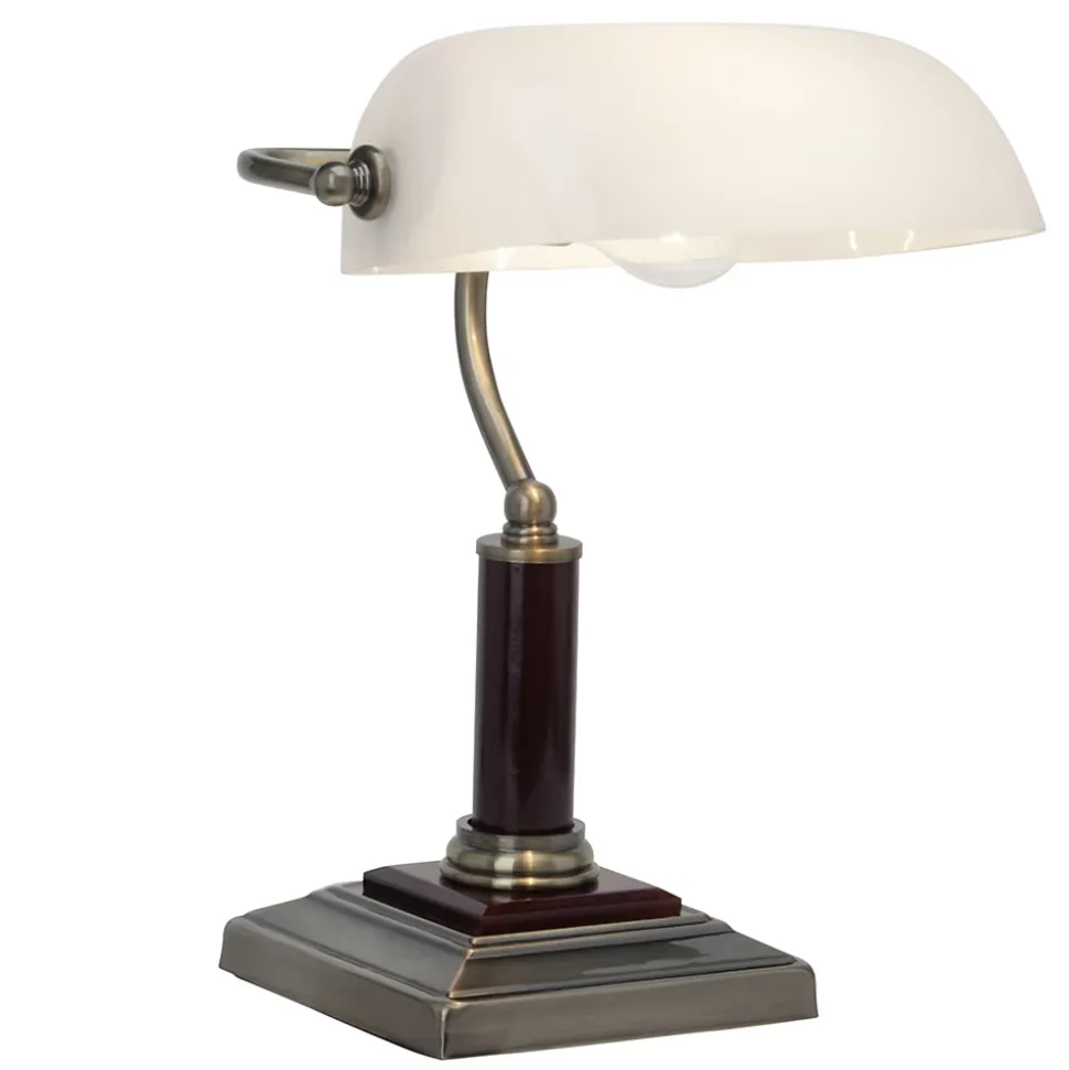 La lampe Bankir revisite un grand classique de la lampe de bureau avec une touche de modernité. L’association du laiton antique à des matériaux nobles comme le verre, le bois et le métal, en fait un objet aussi décoratif que fonctionnel. Avec son diffuseur orientable pour un éclairage directionnel, la lampe Bankir est idéale sur un bureau élégant, dans une bibliotèque ou encore une teble d’appoint de syle vintage. Ampoule non incluse.