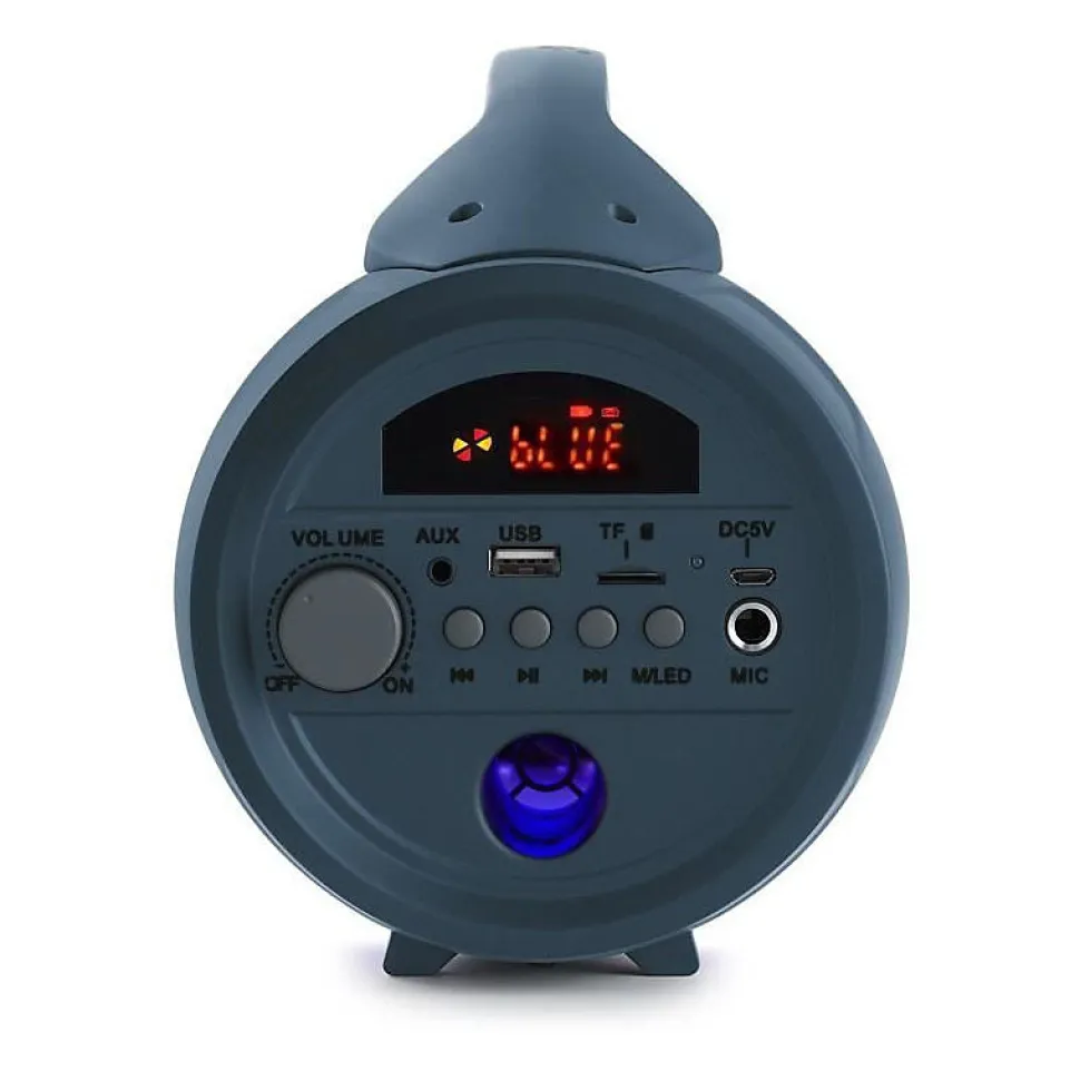 Enceinte lumineuse Bluetooth 50W avec effets lumineux dynamiques synchronisés, micro intégré, batterie rechargeable 1200 mAh, résistante aux éclaboussures (IP54), design compact dark blue, connectivité Bluetooth 5.0 avec portée jusqu’à 10 mètres, compatible smartphone, idéal pour soirées festives et utilisation intérieure/extérieur.