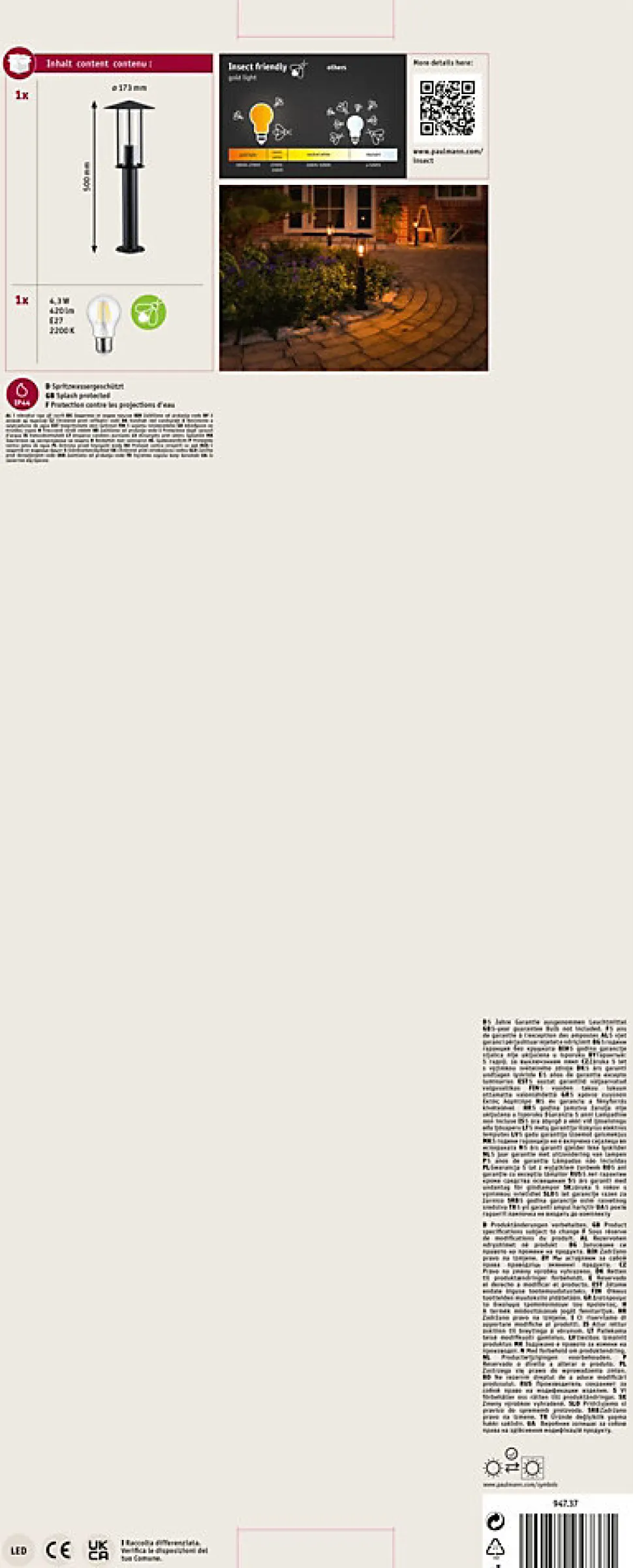 Température de couleur: 2200K – lumière dorée|Lumière dorée – protection active des insectes et ambiance lumineuse chaleureuse aux abords de la maison|Angle de rayonnement de 360° pour un éclairage étendu|Borne lumineuse pour l’éclairage optimal des allées|Convient pour une utilisation à l’extérieur|Protection IP : IP44 – Protection contre les projections d’eau|Pour une lumière du soir agréable et respectueuse des insectes|Ampoules LED également fournies|Parfait pour un éclairage dentrée|La température de couleur dorée garantit une atmosphère intime, comme aux chandelles