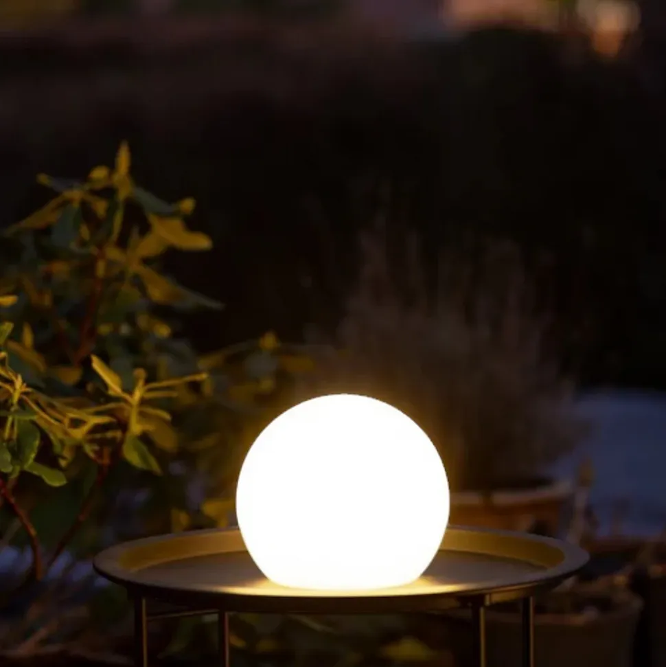 Ces élégantes boules lumineuses LED Mia s’intégreront parfaitement dans n’importe quel jardin ou sur n’importe quel balcon.Bon à savoir-Les boules lumineuses diffusent une lumière blanc chaud.-Elles se rechargent sur secteur en 4 à 8 heures ou au soleil en 8 heures.-Elles restent allumées de 4 à 8 heures après une charge complète.-Elles peuvent également être utilisées à l’intérieur, au sol ou dans n’importe quelle autre pièce.-Vous pouvez contrôler la luminosité à l’aide d’une télécommande (vendue séparément).-Les boules Mia sont donc parfaites pour vos garden-parties et vos réunions entre amis ou en famille, où elles créeront une ambiance magique. Spécifications :-Réf. : 22010-Indice de protection : IP44 (résistant à la pluie fine)-Température de couleur : 2800-3200 Kelvin-Diamètre : 20 cm-Source lumineuse : LED-Autonomie de la batterie : 4-8 h-Puissance : 1 W / 5 V-Télécommande : Oui (à commander séparément)-Temps de charge : 4-8 h