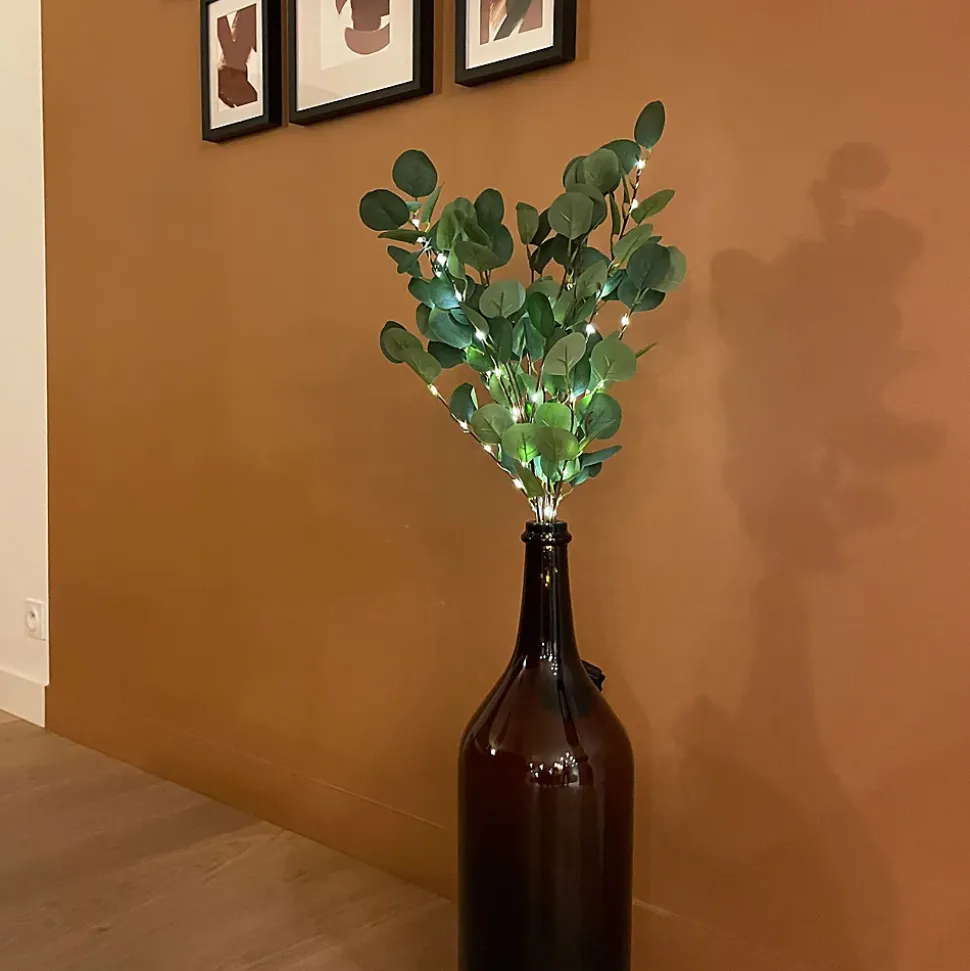 Cette branche lumineuse d’eucalyptus met en lumière vos décorations intérieures ou extérieurs.• Couleur de LED : Blanc Chaud• Nb de LED : 60 microLED• Couleur du câble : Câble argent• Animation : Fixe• Dimensions : 3 branches de H60 cm• Lumens : 90 lumens• Alimentation : A piles, 3 piles AA 1,5V Alkaline, non incluse(s)• Matière : PVC Souple• Usage : Intérieur/Extérieur• Indice de protection : IP44• Garantie : 2 ansUsage & installation :Ces branches lumineuses illuminent votre décoration. Elles trouveront pafaitement leur place dans un vase pour illuminer votre intérieur ou encore votre salon de jardin extérieur. Elles résistent à la pluie grâce à leur boitier adapté pour l’extérieur. Données techniques & dimensions :Cette branche lumineuse est composée de 3 branches. Elle fonctionne avec 3 piles AA non incluses, le boitier des piles est adapté pour un usage extérieur. Vous pouvez utiliser la fonction Timer pour éviter d’éteindre votre guirlande manuellement. Elle s’éteindre toute seule. Fonction Timer : 6h ON et 18h OFF. Le câble est sécurisé par un revêtement. Source lumineuse :Cette branche lumineuse d’eucalyptus est composée de 60 microLED blanc chaud fixe. Sa luminosité est de 90 lumens