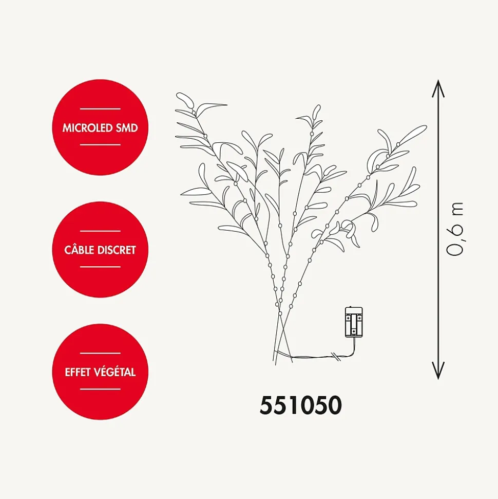 Cette branche lumineuse d’olivier met en lumière vos décorations intérieures ou extérieurs.• Couleur de LED : Blanc Chaud• Nb de LED : 60 microLED• Couleur du câble : Câble argent• Animation : Fixe• Dimensions : 3 branches de H60 cm• Lumens : 90 lumens• Alimentation : A piles, 3 piles AA 1,5V Alkaline, non incluse(s)• Matière : PVC Souple• Usage : Intérieur/Extérieur• Indice de protection : IP44• Garantie : 2 ansUsage & installation :Ces branches d’olivier lumineuses illuminent votre décoration. Elles trouveront pafaitement leur place dans un vase pour illuminer votre intérieur ou encore votre salon de jardin extérieur. Elles résistent à la pluie grâce à leur boitier adapté pour l’extérieur. Données techniques & dimensions :Cette branche lumineuse est composée de 3 branches. Elle fonctionne avec 3 piles AA non incluses, le boitier des piles est adapté pour un usage extérieur. Vous pouvez utiliser la fonction Timer pour éviter d’éteindre votre guirlande manuellement. Elle s’éteindre toute seule. Fonction Timer : 6h ON et 18h OFF. Le câble est sécurisé par un revêtement. Source lumineuse :Cette branche lumineuse d’olivier est composée de 60 microLED blanc chaud fixe. Sa luminosité est de 90 lumens