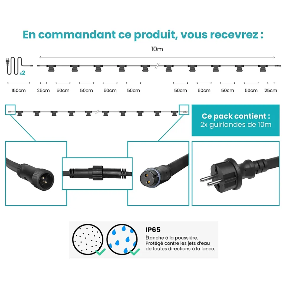- IP65 : Grâce à la norme IP65 de notre guirlande, soyez rassuré ! Notre guirlande est étanche et ne craint pas l’eau et la poussière, vous pouvez ainsi la laisser toute l’année en extérieur !