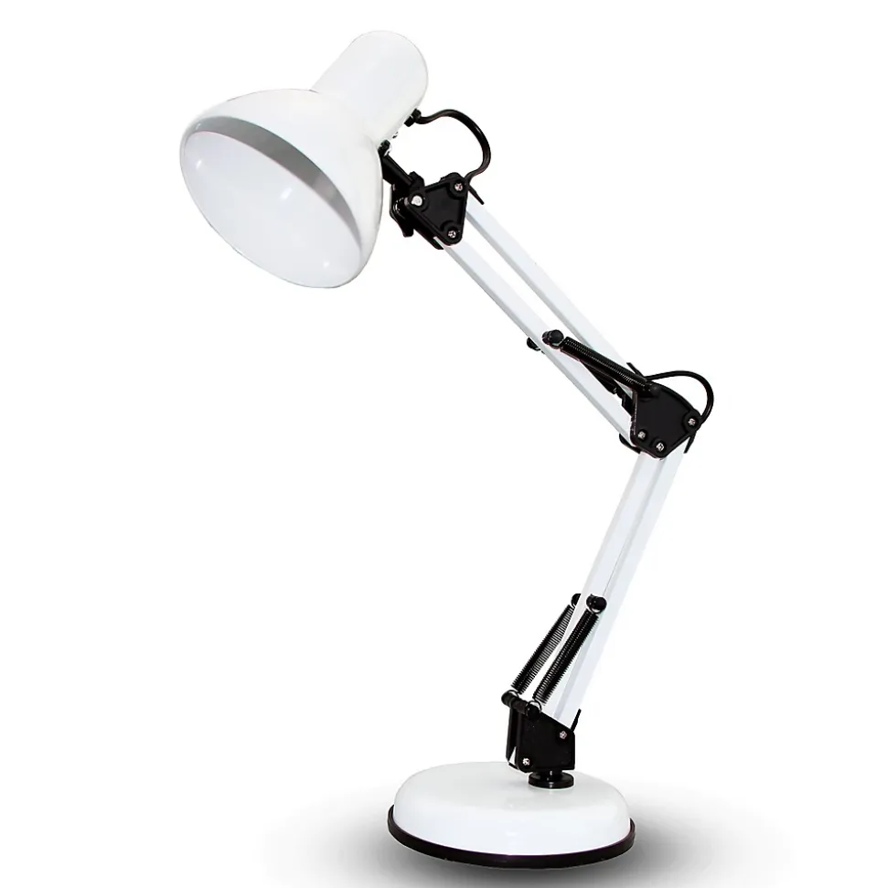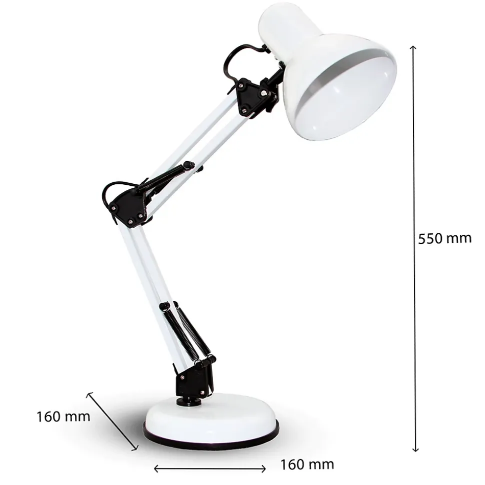 Lampe de bureau avec douille E27 : compatible avec toutes les ampoules E27 (LED, à économie d’énergie, à incandescence) max. 40 W ; ampoule non incluse. Bras orientable, câble 150 cm et interrupteur. Un modèle classique qui ne se démode jamais. Aussi connue sous le nom de lampe ‘d’architecte’ en raison de sa capacité à éclairer parfaitement les grands bureaux. Élégante et minimaliste, pour une maison au style moderne. Elle peut être installée de deux manières : ou posée sur la table à l’aide du socle fourni, ou bien fixée à la table à l’aide de la pratique pince ‘clip’ fournie. Elle peut vraiment être installé n’importe où ! Structure et abat-jour métalliques; abat-jour réglable pour un éclairage parfait.