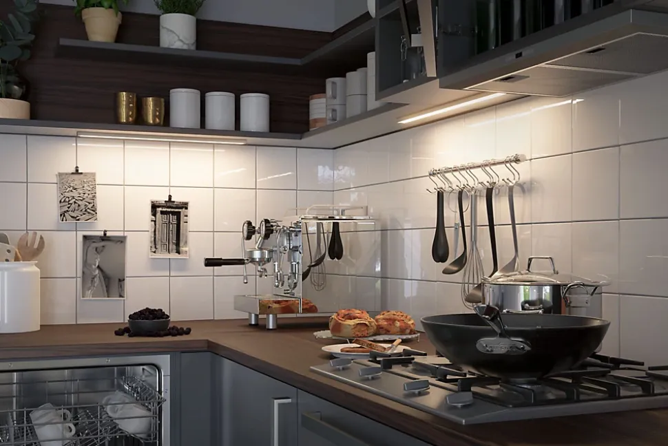 Installez le spot Barre de 55 cm sous l’élément suspendu afin qu’il éclaire le plan de travail. Clever Connect est un système d’éclairage personnalisé de meubles. Installez les luminaires, le driver et les accessoires en toute simplicité et selon vos préférences. La fonction Tunable White allie « travail » et « bien-être » sous la forme d’ambiance lumineuse. Longueur illimitée de câble pour étendre le système en toute liberté.