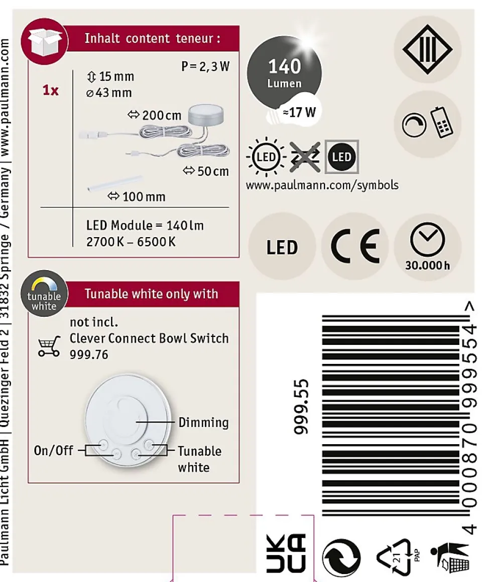 Éclairage de placard fourni avec notice de montage|Température de couleur: 2700K Blanc chaud – 6500K – Lumière du jour|Montage simple par système de connexion
