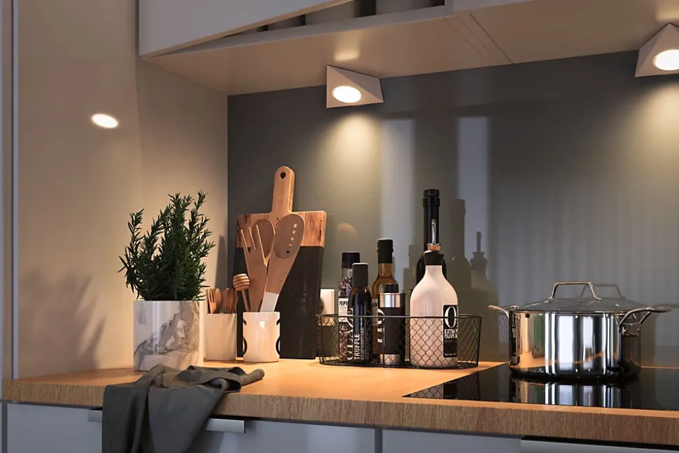 Installez le spot Trigo Blanc dépoli sous un élément suspendu afin qu’il éclaire le plan de travail. Clever Connect est un système d’éclairage personnalisé de meubles. Installez les luminaires, le driver et les accessoires en toute simplicité et selon vos préférences. La fonction Tunable White allie « travail » et « bien-être » sous la forme d’ambiance lumineuse. Longueur illimitée de câble pour étendre le système en toute liberté.