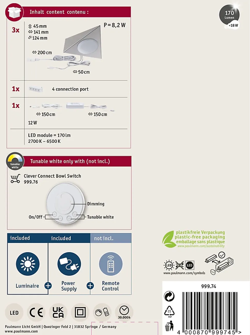Éclairage de placard fourni avec notice de montage|Température de couleur: 2700K Blanc chaud – 6500K – Lumière du jour|La télécommande n’est pas incluse, veuillez la commander séparément si nécessaire.|Montage simple par système de connexion