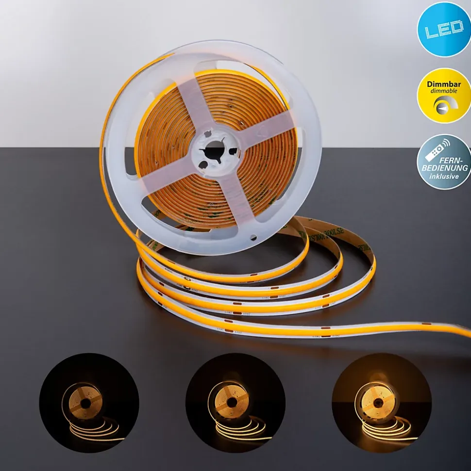 COB-LED-Stripe L : 5 m – le nec plus ultra pour attirer les regards Avec les strips, vous pouvez mettre en valeur des meubles de manière ciblée, souligner certaines zones ou assurer un éclairage indirect d’ambiance. Les possibilités d’application sont multiples. Le produit est fabriqué en plastique de haute qualité et est clair/transparent. Cette bande mesure 500 cm de long, 0,8 cm de large et 0,2 cm de haut. Il est équipé d’une ampoule LED efficace et offre ainsi un éclairage lumineux et économe en énergie. Ce strip convient aussi bien à l’intérieur qu’à l’extérieur et vous offre beaucoup de plaisir. Elle confère à chaque pièce une ambiance chaleureuse et confortable. Le stripe est dimmable et élargit ainsi considérablement les possibilités d’éclairage. Le stripe est alimenté par un raccordement au réseau.
