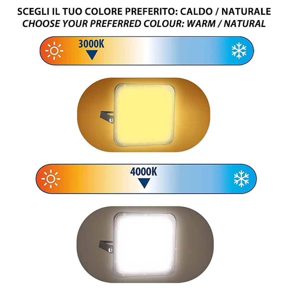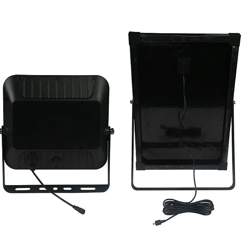 Extrêmement lumineuse : grâce à l’utilisation de LED SMD de dernière génération, la lampe solaire CUBE atteint 9600 lumens. C’est un éclairage de sécurité parfait pour éclairer un passage, une entrée… 2 modes de fonctionnement : 1) Mode lumière constante : la lampe s’allume automatiquement la nuit (vous pouvez régler l’heure et la puissance d’éclairage) 2) Mode détecteur de mouvement : la lampe s’allume automatiquement la nuit. Elle s’allume à la luminosité maximale lorsqu’un mouvement est détecté, puis passe à une luminosité plus faible après 60 secondes sans mouvement. Economie d’énergie : la lampe solaire avec détecteur de mouvement se recharge grâce à un panneau solaire qui reçoit la lumière du soleil… Le tout sans facture d’électricité. Le panneau solaire et le projecteur sont séparés et reliés par un câble de 5 mètres de long : cela permet de placer le panneau là où il recevra le plus de soleil possible, et le spot sous le toit, sur le mur, à l’intérieur… où vous le souhaitez. Installation facile : il suffit de fixer le spot au mur (support réglable) et de le connecter au panneau solaire grâce au connecteur étanche. L’installation est terminée ! Étanche et durable : avec la certification IP65 (résistant à l’eau), cette lampe solaire est adaptée à tous les environnements météorologiques. Corps en polycarbonate extrêmement robuste. Le panneau solaire de 2 W est fabriqué en plastique hyper résistant. La batterie incluse est également remplaçable (Li-Ion 12,8 V 6 Ah) : elle offre jusqu’à 60 heures d’éclairage… Technologie CCT : avec cette technologie vous pouvez choisir entre une lumière chaude 3000K et une lumière naturelle 4000K. Diffuseur opale antireflet. Equipé d’une télécommande pour programmer la lampe.