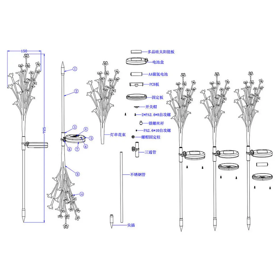 Décoration lumineuse à énergie solaire : FleursMatière : plastiqueNombre de Lumens : 2Durée maximum d’éclairage : 8 heuresInterrupteur on/off LED : 20 LED blanc chaud (3000K)Batteries rechargeables : 1 x 300mAh Ni-Mh AADimensions produits : (voir le schéma technique parmi les images)H : 725 / 670 – largeur MAX : 420 – profondeur MAX : 420 mm
