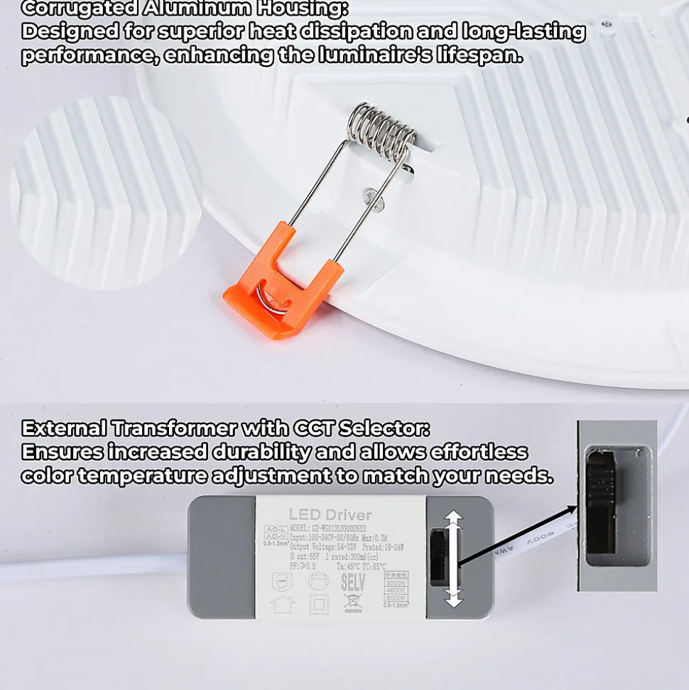 Downlight LED Circulaire 25W – Haute Efficacité et PolyvalenceCe downlight LED de 25W se distingue par son design compact, sa polyvalence et ses performances supérieures, idéal pour les espaces intérieurs comme les bureaux, cuisines et commerces.Caractéristiques Principales :Sélecteur CCT Intégré (4 positions) : Changez entre 3000K, 4000K et 6000K depuis le driver ou l’interrupteur mural.Haute Efficacité Lumineuse : 115LM/W, offrant un éclairage puissant et uniforme.Boîtier en Aluminium Rainuré : Favorise la dissipation thermique et prolonge la durée de vie jusqu’à 25 000 heures.Installation Facile : Découpe Ø190 mm et diamètre extérieur Ø230 mm ; épaisseur réduite de 35 mm (avec clips).Angle de Faisceau : 120 degrés pour une lumière homogène et diffuse.Design Polyvalent : Compatible avec les faux plafonds, parfait pour les espaces avec peu de hauteur disponible.Spécifications Techniques :Puissance : 25WTension : 220-240VMatériau : AluminiumUtilisation : Intérieur uniquement (IP20)Un produit moderne et efficace qui associe technologie et design pour une solution d’éclairage durable et adaptable.