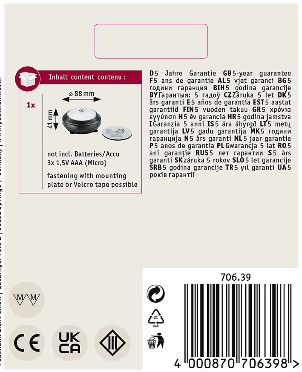 Avec interrupteur Marche/Arrêt/variation d’intensité intégré|Fonctionnement sur piles pour une utilisation polyvalente|Fourni avec pads adhésifs : possibilité de montage sans percer|Température de couleur: 3000K – Blanc chaud|La technologie LED fait économiser jusqu’à 80 % d’énergie par rapport aux ampoules à incandescence classiques.