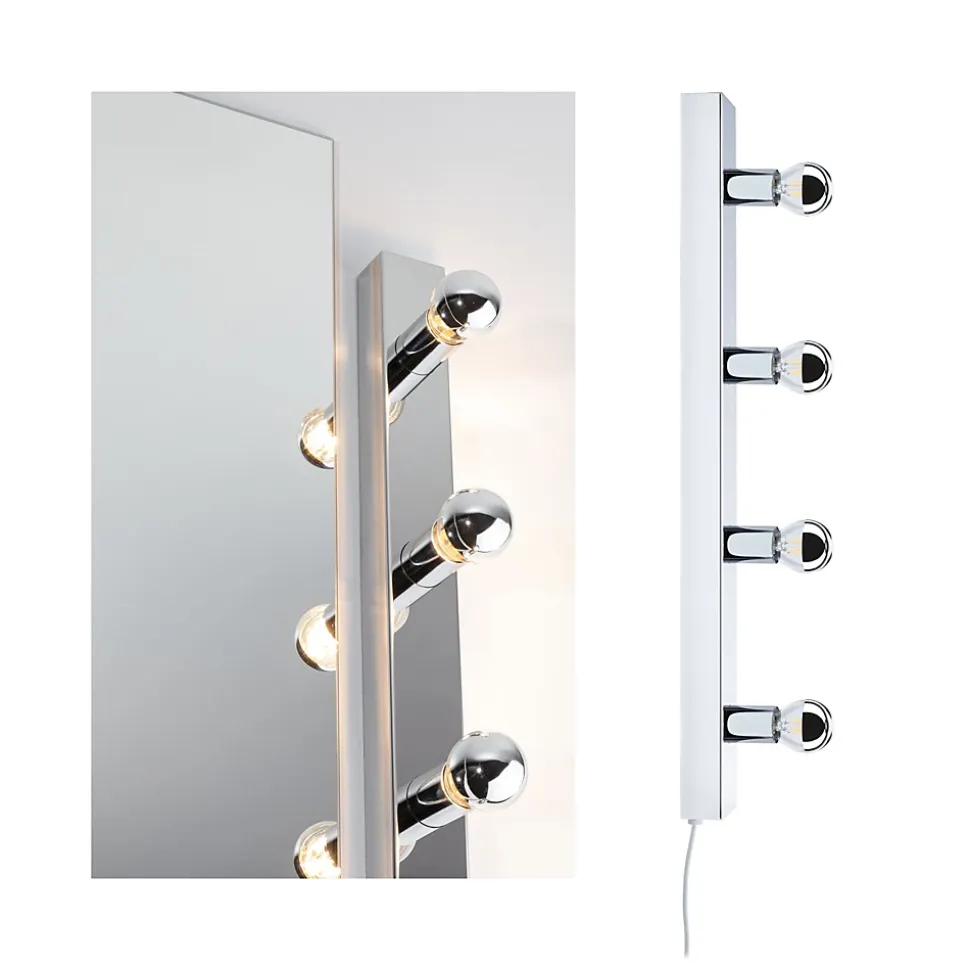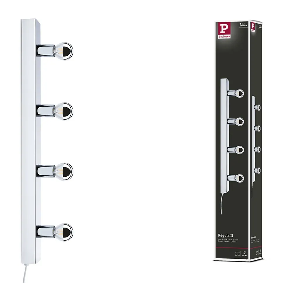 Le Regula II à 4 flammes est le choix idéal pour un éclairage de miroir décoratif. Elle est livrée avec un connecteur de câble textile pratique de couleur Chrome, rendant son installation très facile. Une seule prise de courant est nécessaire, il n’est pas nécessaire de prévoir une sortie de courant au mur. Avec son design moderne et épuré en Chrome, elle s’intègre harmonieusement dans différents styles d’intérieur et attire l’attention visuellement aussi bien sur la coiffeuse que dans le couloir. La longueur de 60 cm est adaptée aux dimensions standard des miroirs. Elle est également disponible avec différentes ampoules avec douille E14, ce qui permet de la personnaliser en fonction de l’application. Pour un look glamour de miroir de maquillage façon Hollywood, les éclairage de miroir sont particulièrement adaptées. Elles assurent un éclairage non éblouissant et créent des réflexions lumineuses très esthétiques. Pour un look moderne et classique, il suffit d’utiliser des ampoules opales qui diffusent une lumière omnidirectionnelle. L’installation du Regula II est très simple : elle peut être montée sur le mur au-dessus ou à côté du miroir. Il suffit de visser les ampoules souhaitées pour qu’elle soit immédiatement opérationnelle. Pour nettoyer les luminaires, il est préférable d’utiliser un chiffon doux – évitez d’utiliser un chiffon en microfibre. Selon l’ampoule utilisée, la lampe est dimmable.