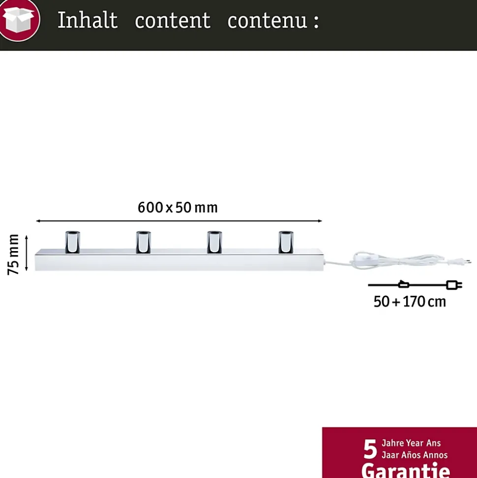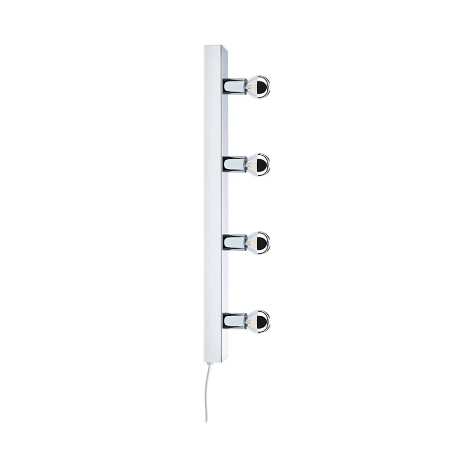 Connecteur de câble textile inclus pour montage facile|Surface/couleur: Chrome|Réglette lumineuse Regula à 4 flammes au design moderne et épuré|Ne pas oublier : Commandez l’ampoule adaptée en même temps !|Astuce-ampoule : Les lampes à calotte argentée sont décoratives et vous garantissent une lumière non éblouissante|Utilisation flexible d’ampoules avec douille standard E14
