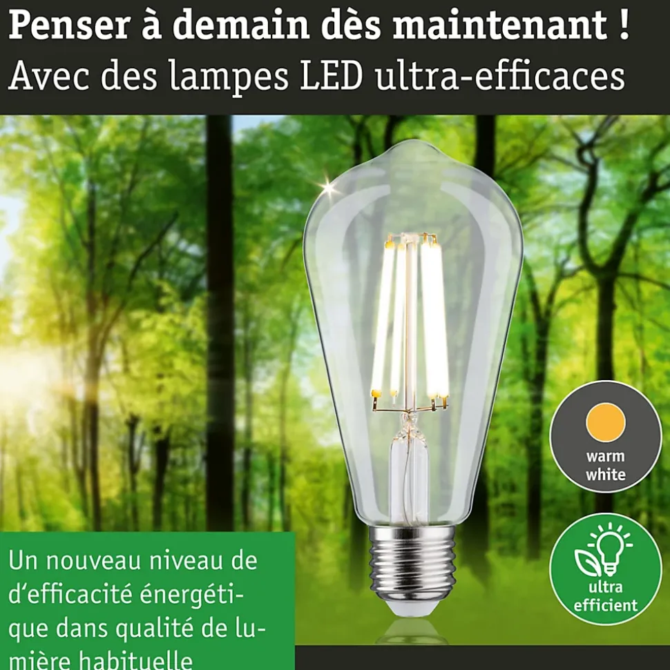 Les ampoules ultra efficaces de l’Eco-Line combinent innovation et durabilité. Grâce à une consommation d’énergie réduite de 60 % et à une durée de vie résolument plus longue que celle des ampoules LED standard, il est possible de réduire considérablement les coûts énergétiques tout en préservant l’environnement. L’ampoule cylindrique à filament claire avec 4000K, une puissance de 4W et 840lm diffuse sa lumière dans toutes les directions sans teinte verdâtre. Les lampes LED confèrent une parfaite ambiance Vintage et, installées dans des suspensions rétro, sont de vraies accroche-regard. Elle produit une température de couleur blanc neutre et se combine avec toutes les douilles conventionnelles E27. Les lampes LED Paulmann portant le label Eye friendly produisent une lumière confortable qui préserve les yeux. Que ce soit pour travailler, lire ou se détendre, les lampes contribuent à un meilleur confort visuel.