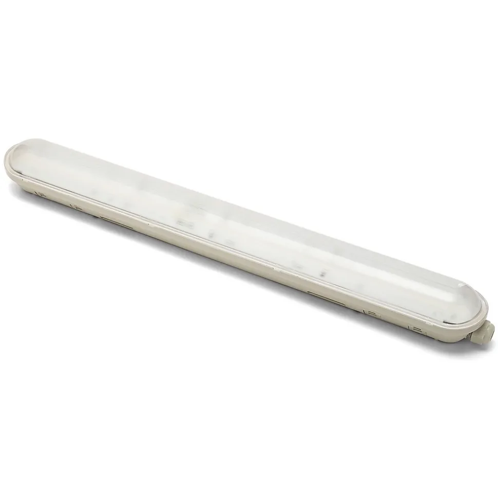 Plafonnier étanche IP65 avec LED intégrées 21W, 2730lm, super lumineux; longueur: 59cm. driver inclus; structure et diffuseur en polycarbonate; produit de longue durée. Température de lumière: 4000K; IRC: 80; faisceau: 120; Durée de vie des LED: 30 000 heures. Excellent pour les environnements humides tels que garage, cave, buanderie; convient aux zones extérieures exposées aux jets d’eau directs et à la pénétration de fines poussières. Résistant (IK08) et certifié TUV. Équipé d’un presse-étoupe d’entrée et de sortie pour un montage en série.