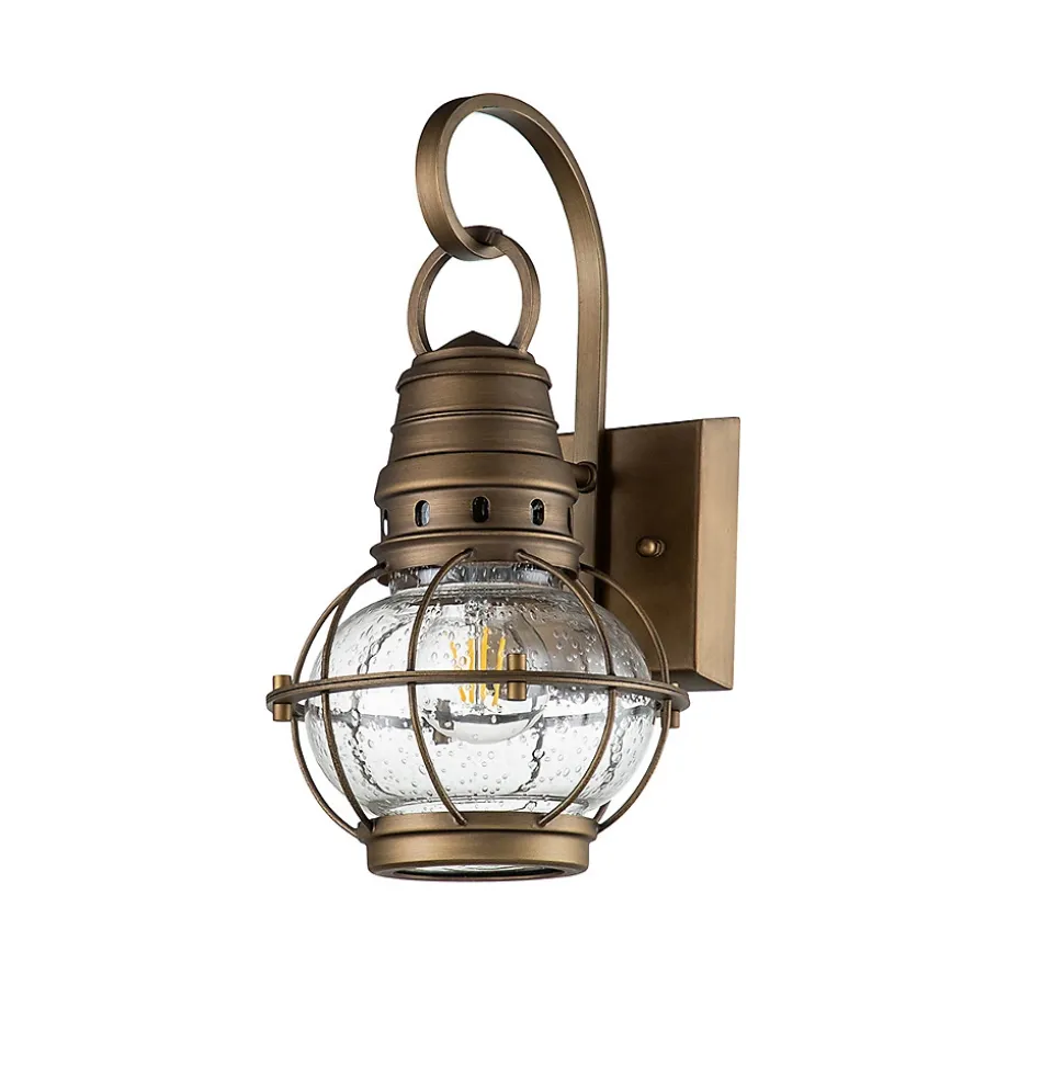 Elstead Kichler Bridgepoint Lanterne murale d’extérieur en laiton naturel, IP44Fini : Laiton naturelMatériau : aluminium, verre granuleux transparentClassement IP : IP44Hauteur : 33,4 cmLargeur : 17,8 cmProfondeur : 20,7 cmDiamètre : 17,8 cmType de lampe : E27Nombre de lampes : 1Ampoule incluse : NonPuissance (max): 60W
