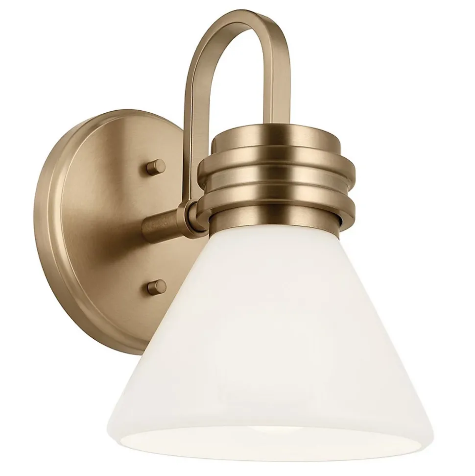 Elstead Kichler Farum Applique de salle de bain classique bronze champagne 3000 K IP44 1x G9Finition : Bronze champagneMatériau : Acier, verre opale brillantIndice de protection : IP44Hauteur : 24 cmLargeur : 17,8 cmProjection : 21,5 cmType de lampe : G9Nombre de lampes : 1Ampoule incluse : OuiIntensité variable : Oui – Lampes à intensité variable requisesKelvin : 300 lmLumens : 3 000 KPoids : 0,95 kgPuissance (max.) : LED 3 W