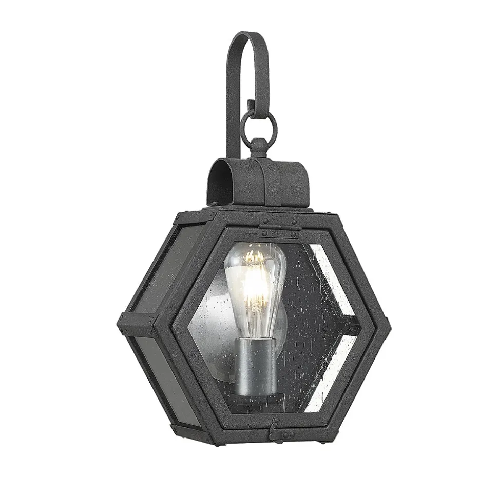 Elstead Quoizel Heath Lanterne murale d’extérieur noir chiné, IP44Finition : Noir tachetéMatériau : aluminium, laiton, acier, verre granuleux transparentClassement IP : IP44Hauteur : 41,8 cmLargeur : 26,7 cmProfondeur : 12,5 cmType de lampe : E27Nombre de lampes : 1Ampoule incluse : NonPuissance (max): 40W