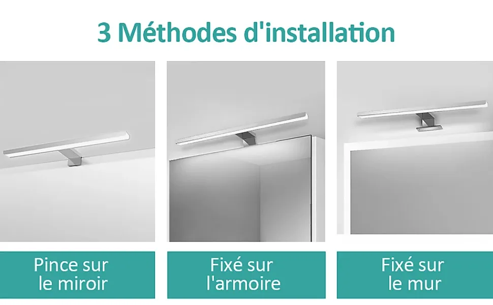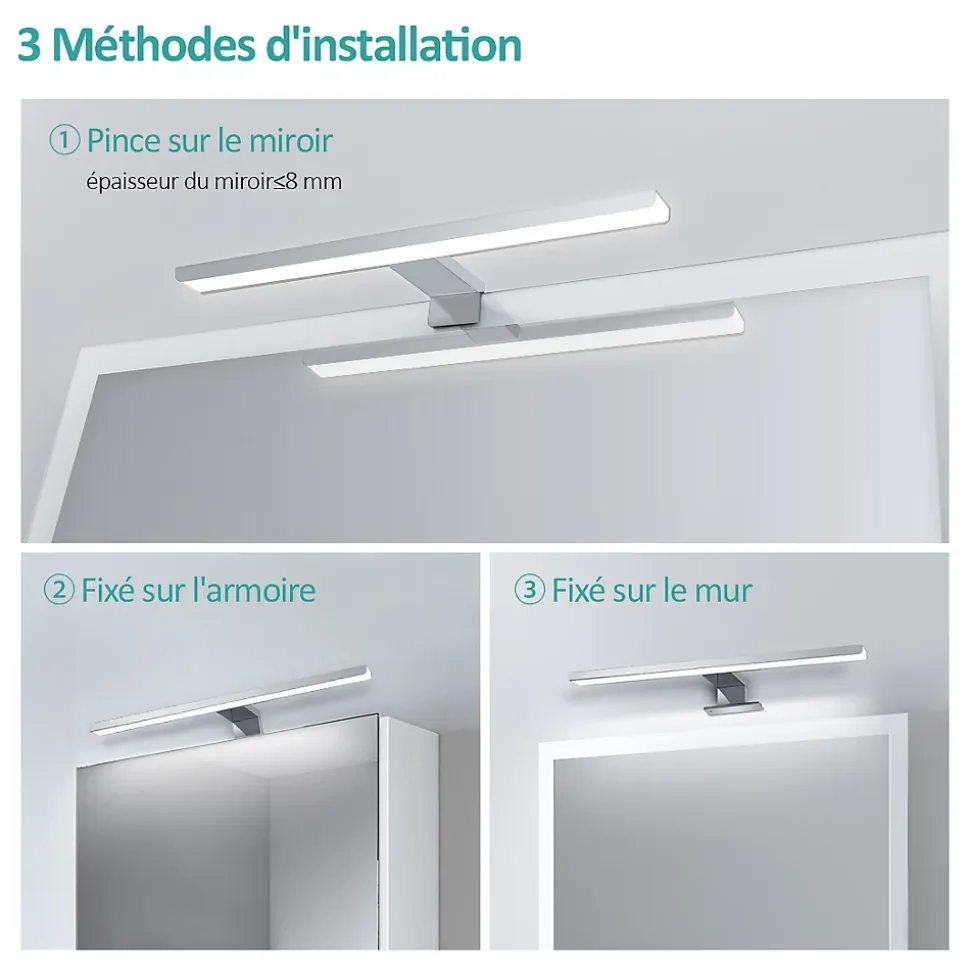 EMKE propose une gamme d’appliques murales LED conçues pour illuminer votre salle de bain avec élégance et efficacité. Grâce à leur éclairage lumineux et homogène, ces lampes offrent un confort visuel optimal pour vos routines quotidiennes. Leur design moderne s’intègre parfaitement à tout style de décoration, apportant une touche de sophistication et de praticité à votre espace.1. Large compatibilité de tension : fonctionne en douceur avec une plage de tension de 85 à 260 V, garantissant des performances fiables dans divers paramètres.2. Trois options d’installation : fixez la lampe de miroir à votre miroir (convient aux miroirs d’une épaisseur ≤ 8 mm), fixez-la à votre armoire à miroir ou montez-la directement sur le mur.3. Éclairage lumineux et uniforme : la température de couleur fixe de 6 000 K fournit un éclairage brillant, semblable à la lumière du jour, pour votre salle de bain ou votre coiffeuse.4. Énergie économe en énergie : consomme seulement 8 W, offrant un éclairage optimal tout en économisant de l’énergie.5. Sécurité renforcée : livré avec une ligne de terre dotée d’une étiquette de mise à la terre et d’une alimentation isolée pour une utilisation sécurisée.
