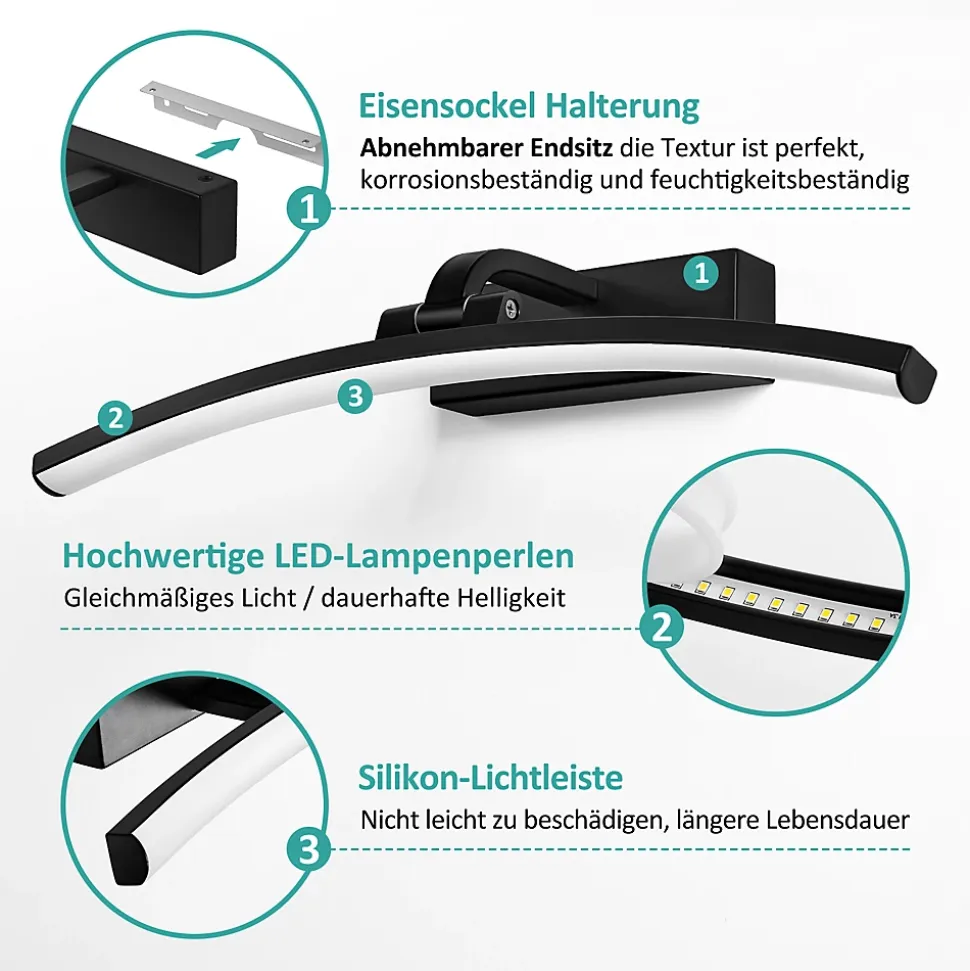 Les appliques murales LED EMKE allient innovation et design pour répondre aux besoins d’éclairage des salles de bain modernes. Avec une technologie LED avancée, elles assurent une lumière efficace tout en économisant de l’énergie. Que ce soit pour se préparer le matin ou créer une atmosphère relaxante en soirée, elles apportent une solution d’éclairage fiable et élégante.1. Construction compacte et élégante : la lampe mesure 40 cm de long avec une base de L15 x l5 x H3 cm, combinant fonctionnalité avec une finition noire mate élégante pour compléter n’importe quel décor de salle de bain moderne.2. Performance d’éclairage optimale : dotée d’une température de couleur de 4000 K et d’une puissance de 8 W, cette lampe de miroir délivre environ 585 lumens avec un indice de rendu des couleurs (IRC) de > 80 Ra, assurant un éclairage naturel et vibrant.3. Conception réglable : la tête de lampe est réglable jusqu’à 180°, vous permettant de diriger la lumière précisément là où vous en avez besoin pour plus de commodité.4. Pilote durable et certifié : équipé d’un pilote à courant constant isolé IC certifié CE, garantissant sécurité, fiabilité et performances durables.5. Installation polyvalente : conçue pour une installation facile, cette lampe de miroir est parfaite pour les salles de bains, les zones de vanité et les dressings, ajoutant élégance et praticité à votre espace.