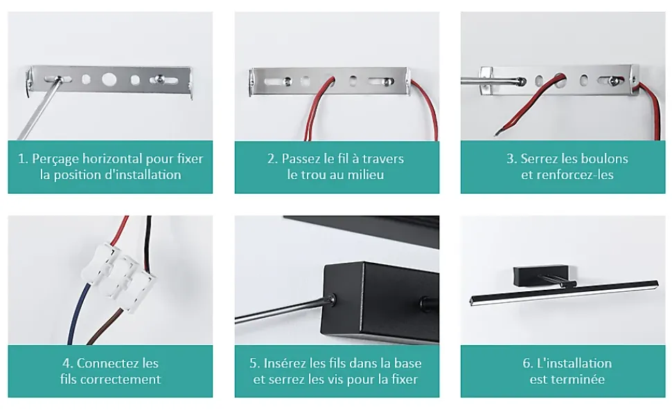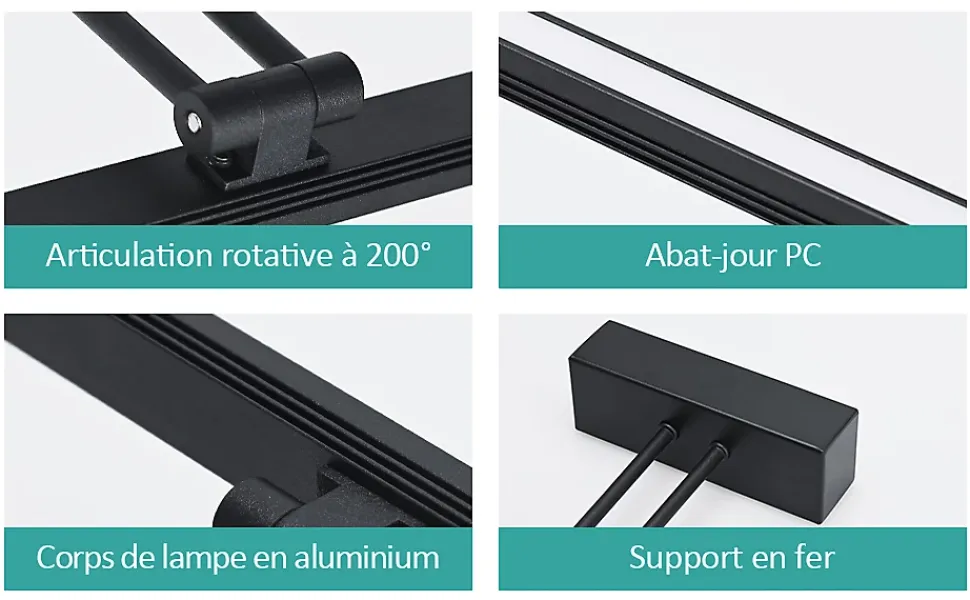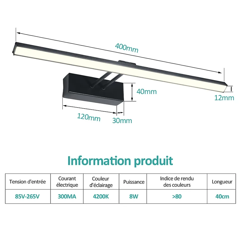 Découvrez la lampe miroir LED EMKE, conçue pour allier praticité et style, idéale pour illuminer votre salle de bain ou votre cuisine tout en apportant un éclairage flexible et efficace.Rotation 200° : Cette lampe miroir LED est spécialement conçue pour permettre une rotation de 200°. Vous pouvez ajuster la direction de la lumière selon vos besoins.Haute qualité : Résistante à la condensation, elle offre une lumière claire et pénétrante même dans les environnements humides comme les salles de bain.Commande pratique : La lampe miroir se connecte directement au câble et peut être contrôlée via un interrupteur mural (remarque : lampe fournie sans interrupteur), 8 W | 4200 K, elle peut également servir d’éclairage d’appoint.Économique en énergie : La lampe miroir consomme 80 % moins d’énergie qu’une ampoule classique. Son style simple s’adapte à différents types de décoration.Fiable : Nous vous offrons un service de qualité pour garantir une expérience d’achat sans souci. En cas de problème, contactez-nous à tout moment pour une assistance après-vente.